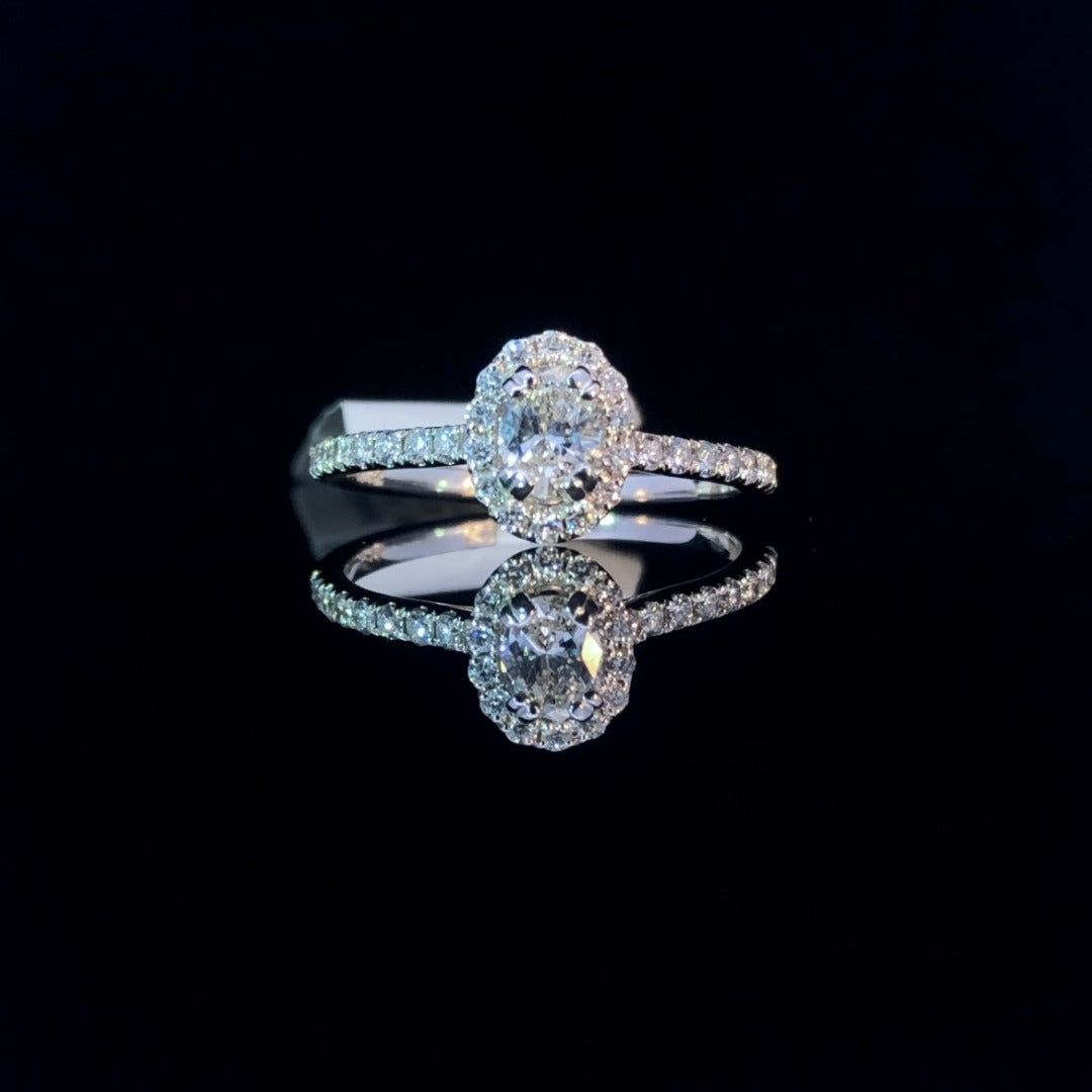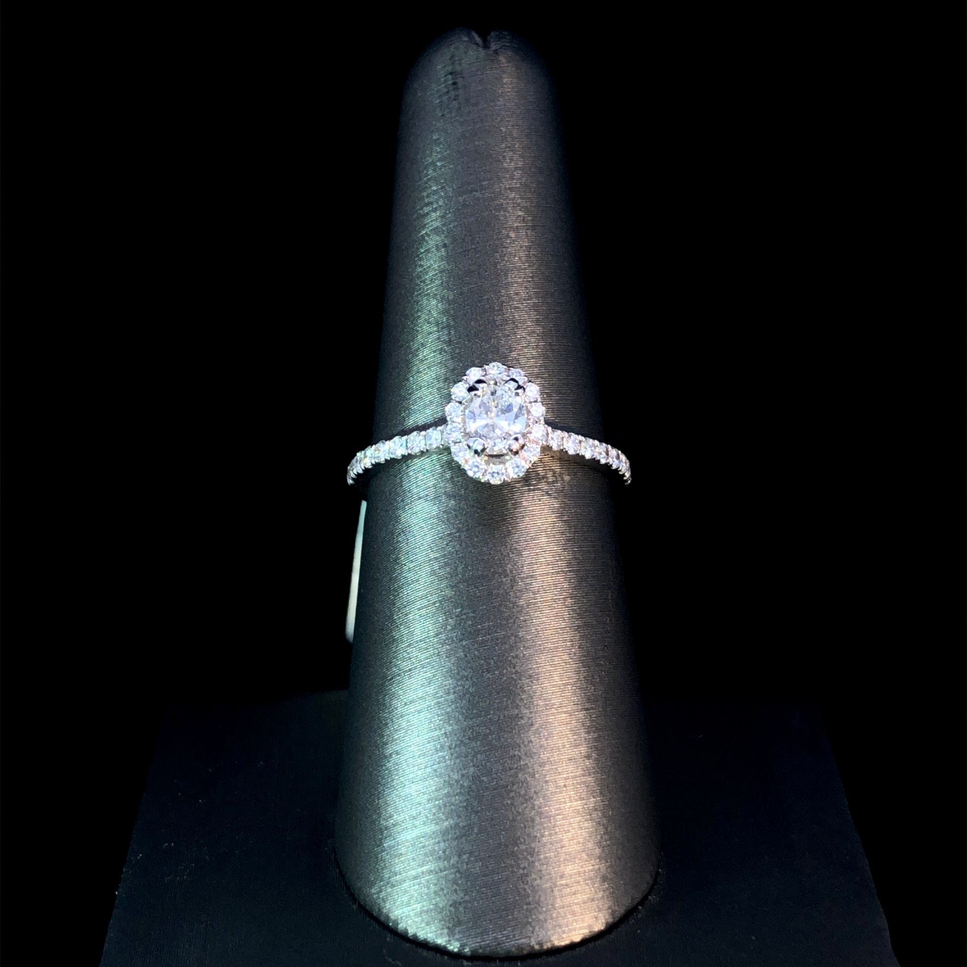 This exquisite ring is a classic, with a dazzling .34ct oval diamond set at its center and surrounded by a halo of glittering diamonds. Further enhanced with diamonds down its elegant 14kt white gold band, its total .66ctw of diamonds, makes this the perfect symbol of timeless sophistication and glamour. This ring is a size 7. If that size is not a perfect fit, first time sizing is free at the time of purchase.