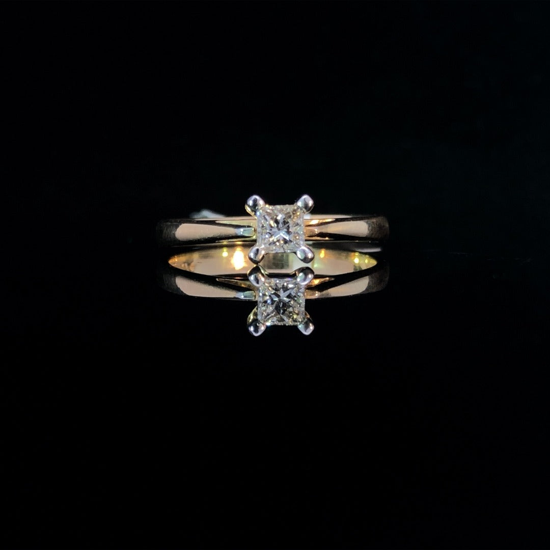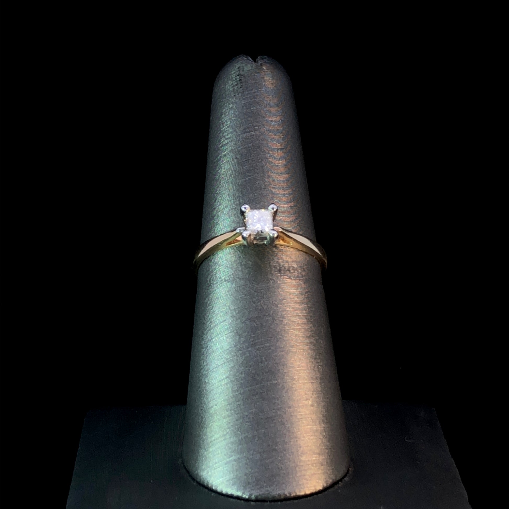 This beautiful solitaire ring showcases a .27ct princess cut diamond set in a white gold head for a brilliant sparkle. The 14kt yellow gold band has a tapered cathedral style to bring focus to the center diamond. A timeless piece that will never go out of style. This ring is a size 6.5. If that size is not a perfect fit, first time sizing is free at the time of purchase. Additional sizing fees may apply.