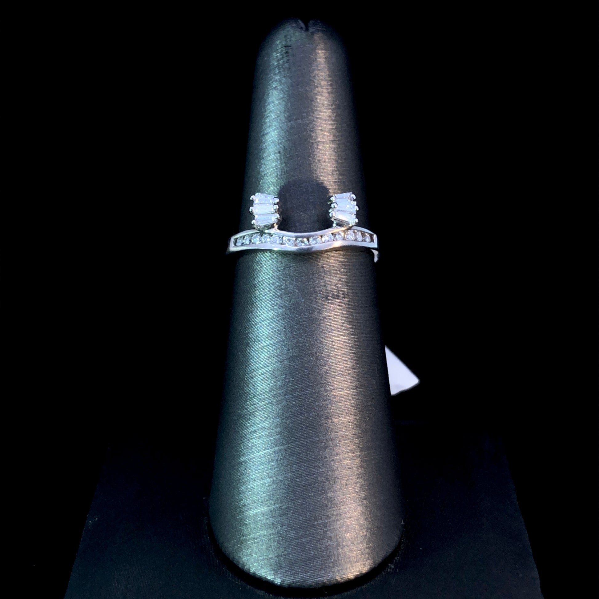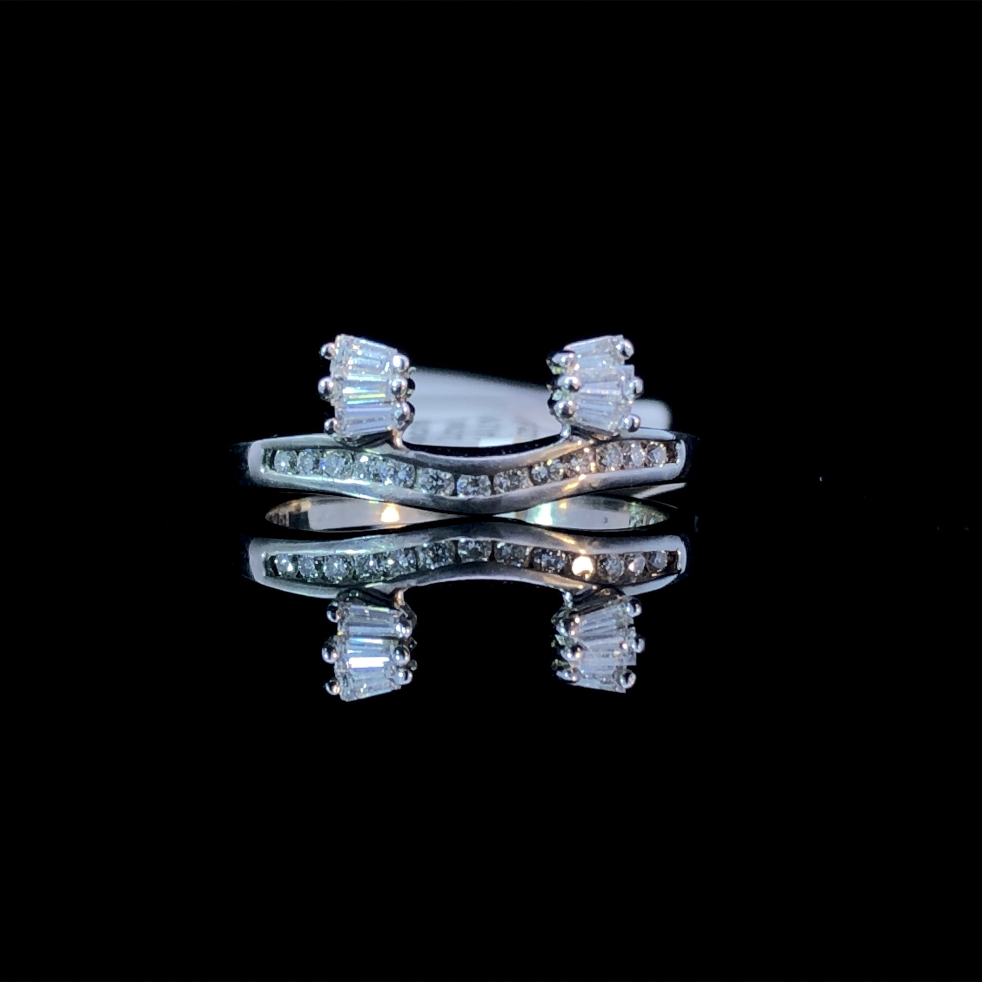 Adorn your center stone with this stunning 14kt white gold ring enhancer. Its classic design features a band of round diamonds, further enhanced by 6 dazzling baguette diamonds for a total carat weight of 0.25ctw. Let this timeless piece sparkle and shine! This ring is a size 6. If that size is not a perfect fit, first time sizing is free at the time of purchase. Additional sizing fees may apply.