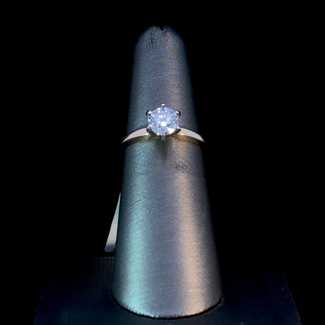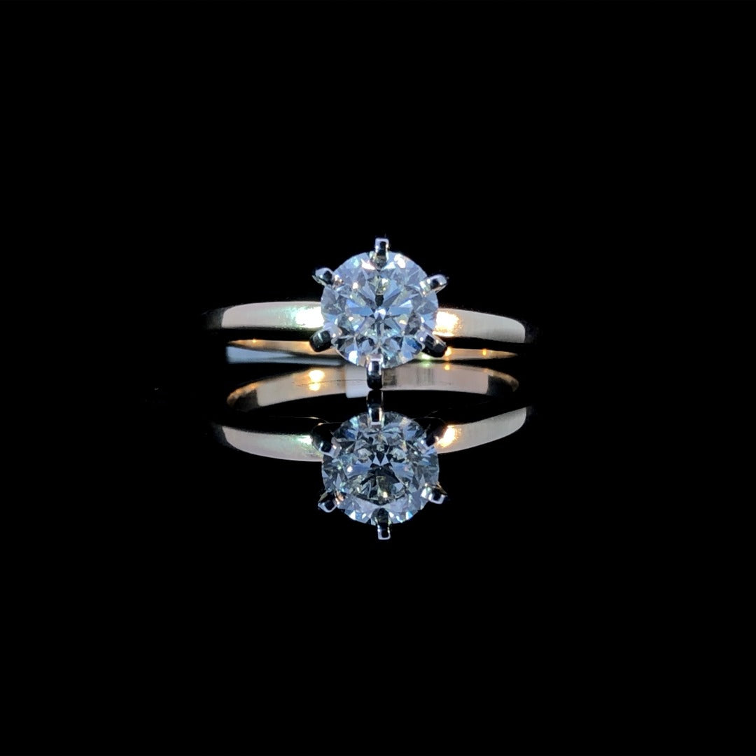 This elegant 1.00ct round diamond solitaire ring is crafted to perfection with a 14kt 2-tone gold mount. Perfectly paired, the dazzling white gold head brilliantly contrasts the warm yellow gold band. Make a statement with this gorgeous classic! This ring is a size 7. If that size is not a perfect fit, first time sizing is free at the time of purchase. Additional sizing fees may apply.