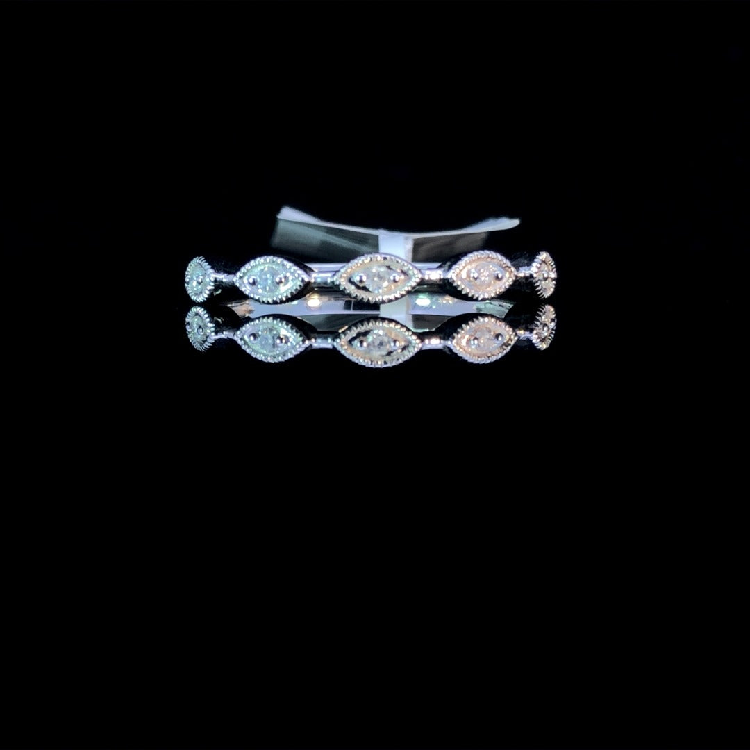 This luxurious 10kt white gold milgrain band makes a sophisticated statement with its distinctive marquise shape containing .05ctw of sparkling round diamonds. Exude timeless elegance with this exquisite piece, crafted to impress. This ring is a size 7. If that size is not a perfect fit, first time sizing is free at the time of purchase. Additional sizing fees may apply.