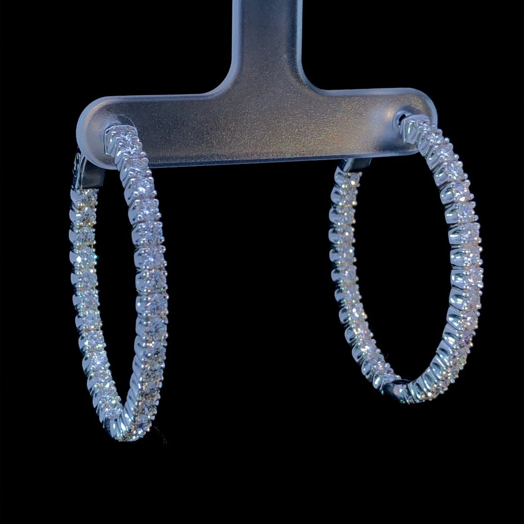 Discover a timeless classic with these sparkling diamond hoop earrings. The round diamonds are set both inside and outside 14kt white gold hoops, creating 3.00 ctw of mesmerizing brilliance. Treat yourself to elegant sophistication and the unparalleled beauty of diamonds!