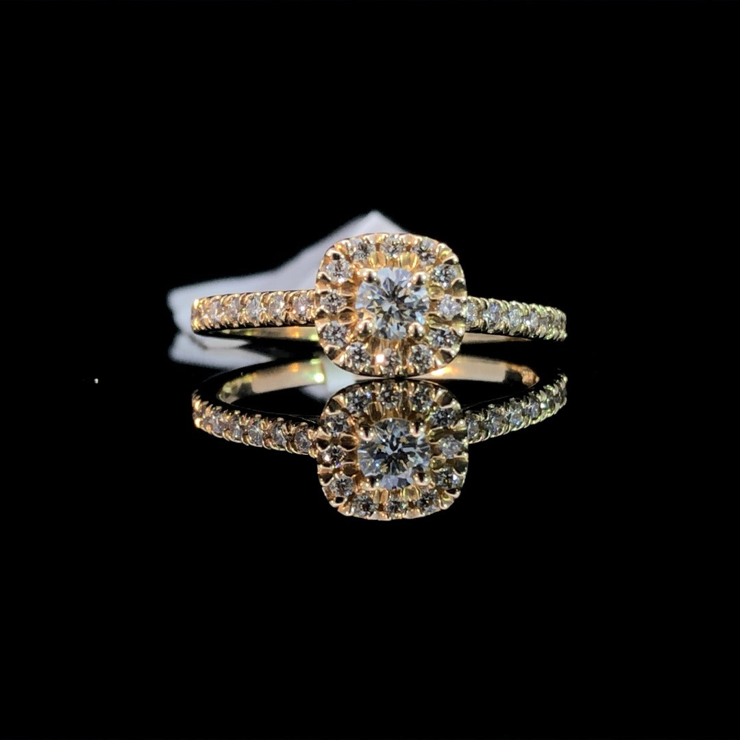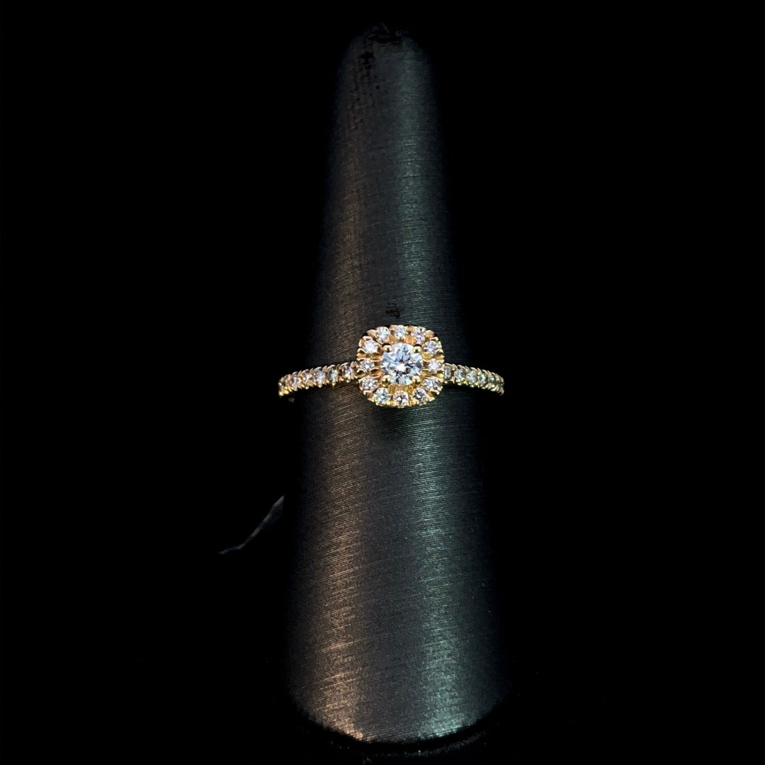 Fall in love with this stunning 14 kt yellow gold ring! Featuring a classic round diamond at its center, surrounded by a sparkling halo and cascading diamonds on the band, this ring exudes timeless elegance. With a total diamond weight of .46 ctw, it's the perfect way to add sparkle to any look. This ring is a size 7.25. If that size is not a perfect fit, first time sizing is free at the time of purchase. Additional sizing fees may apply.