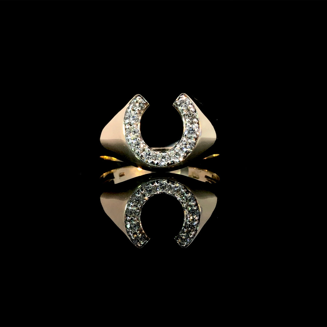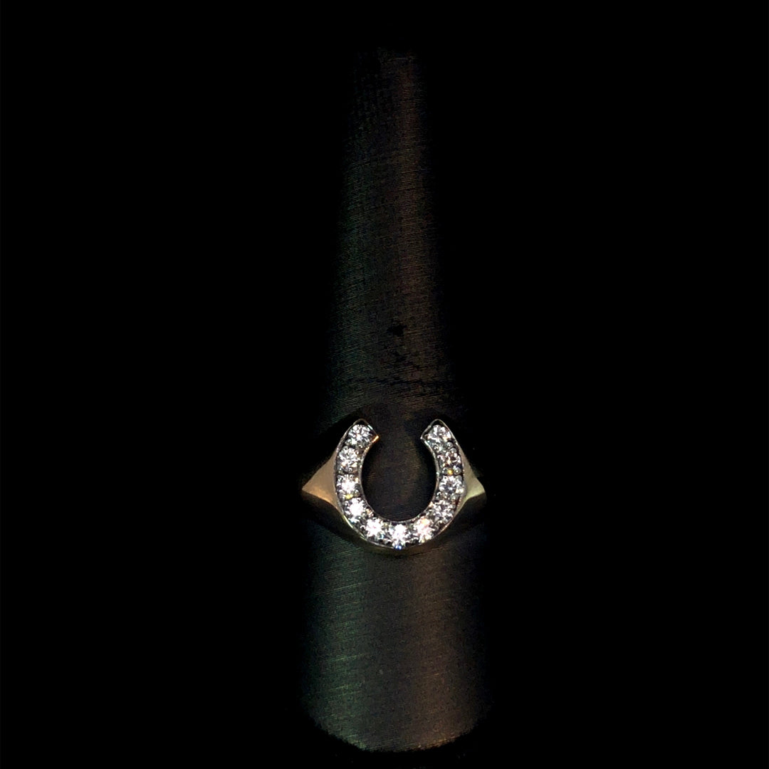 Featuring a .30ctw diamond horseshoe in 10kt yellow gold, this ring exudes confidence and class. Perfect for any occasion, it's a must-have for any fashion-forward man. This ring is a size 10. If that size is not a perfect fit, first time sizing is free at the time of purchase. Additional sizing fees may apply.