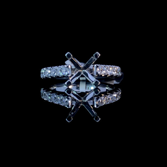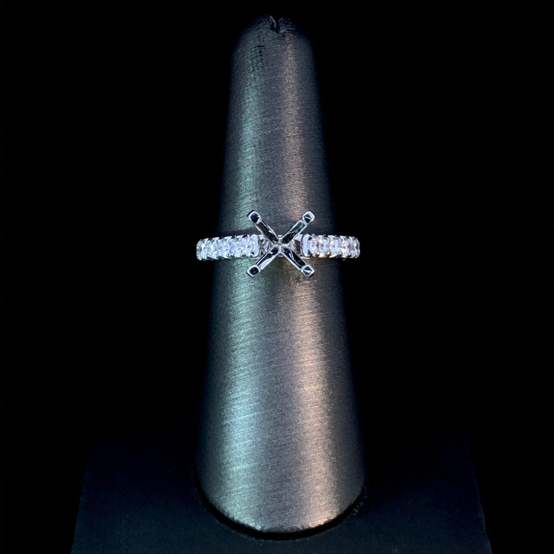Make a statement with this stunning diamond semi mount! Featuring a cathedral-style band and .95ctw of round diamonds set in 14kt white gold, it's the perfect choice for anyone looking to make an unforgettable impression. Add your own center stone for unparalleled sophistication and luxury! Price is for the semi mount only. Center stone will be added at an additional cost. This ring is a size 6.5. If that size is not a perfect fit, first time sizing is free at the time of purchase. Additional sizing fees may apply.