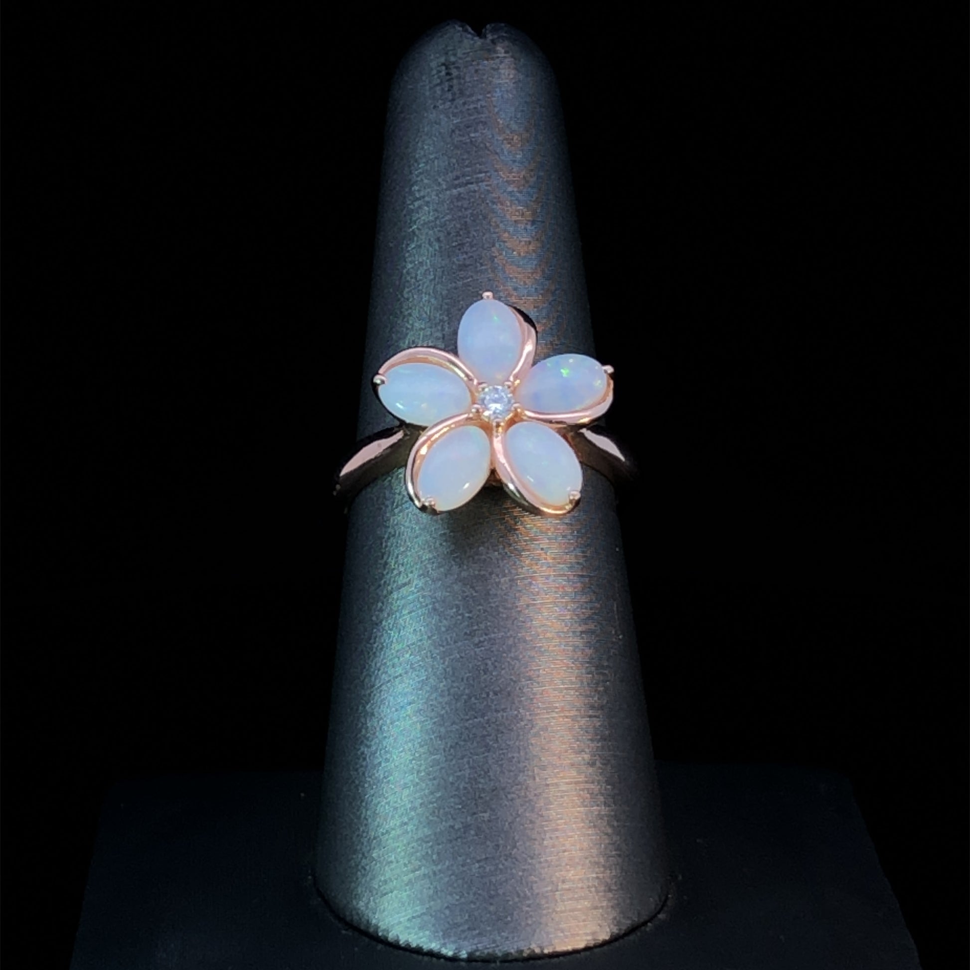 This "Rose Gold Blooming Beauty" is sure to make you shine! This exquisite opal and diamond ring features 1.40 ctw of oval shaped opals set in a flower-shaped 14 kt rose gold mounting, topped off with a sparkly .05 ct round diamond in the center. Don't miss your chance to blossom with this dazzling accessory! This ring is a size 7.25. If that size is not a perfect fit, first time sizing is free at the time of purchase. Additional sizing fees may apply.