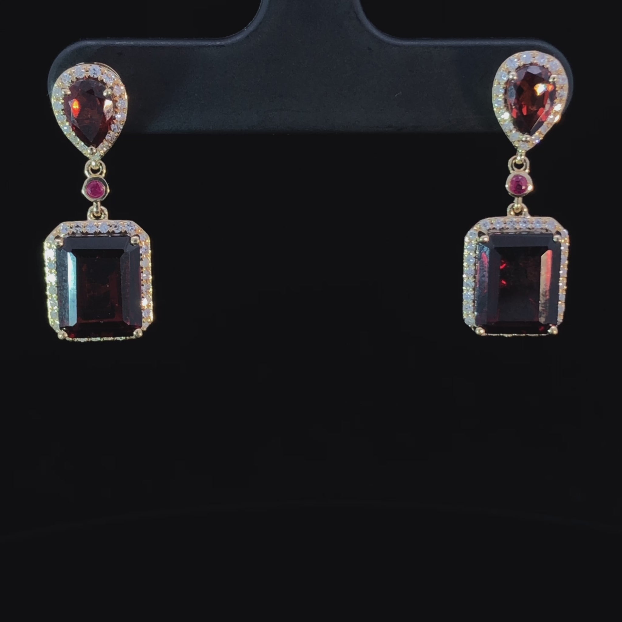 Embellished with 8.60 ctw of lavish garnet and ruby stones, these 14 kt yellow gold dangle earrings are a luxurious sight to behold. .27 ctw of round diamond accents twinkle in the light, enhancing the earrings' grandeur. Dazzling and exclusive, these earrings will bring true elegance to your wardrobe.