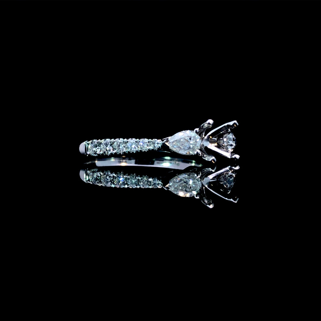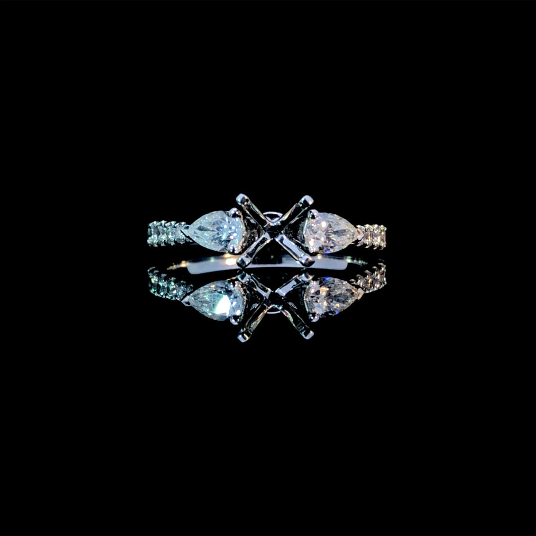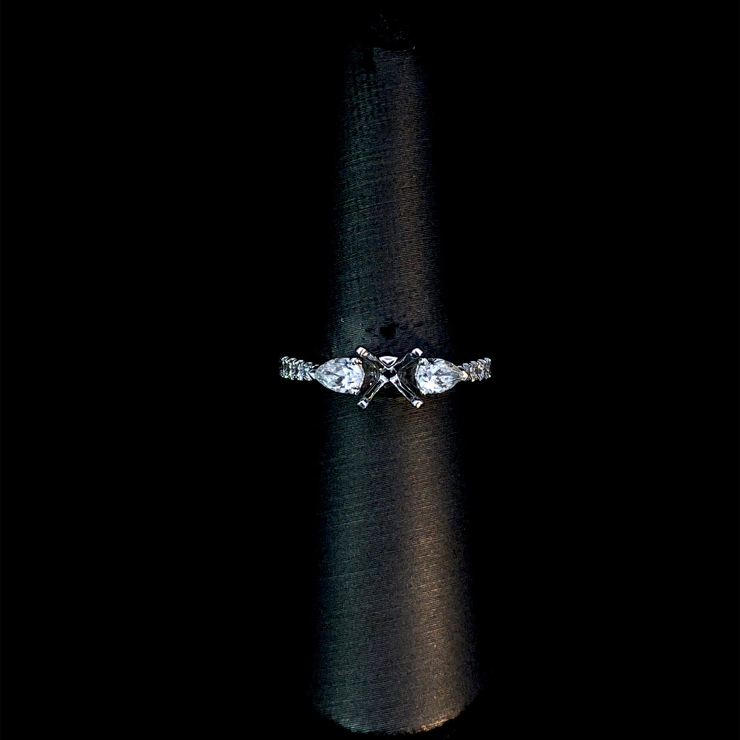This diamond semi-mount dazzles with two pear-shaped diamonds on each side of the head, complemented by round diamond accents along the 14kt white gold band. With a total carat weight of 0.65ctw, it offers a beautiful framework to add your preferred center stone from our loose diamond selection, creating a meaningful and personalized piece you'll cherish for years to come. Price is for the semi mount only. Center stone will be added at an additional cost. This ring is a size 7. If that size is not a perfect fit, first time sizing is free at the time of purchase. Additional sizing fees may apply.