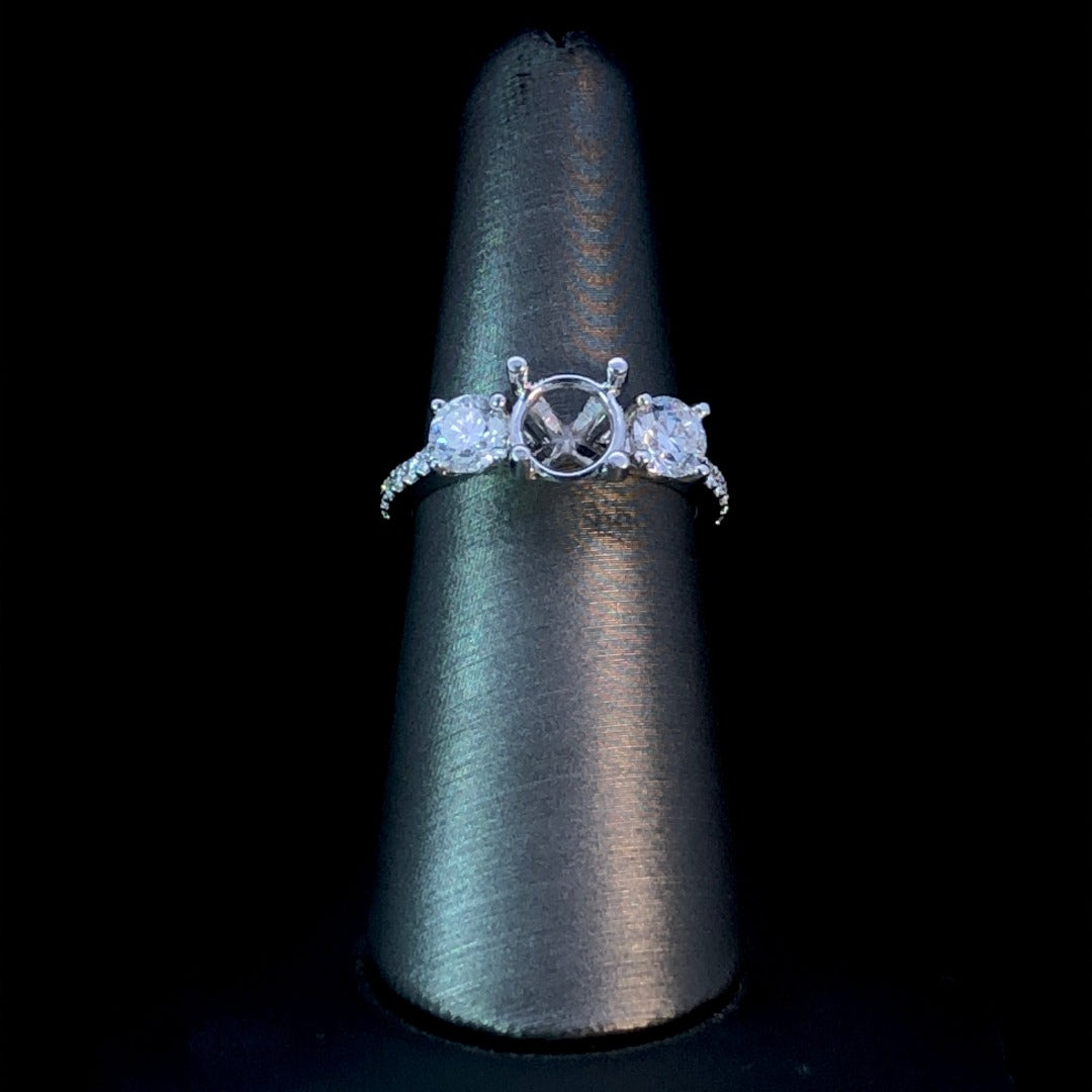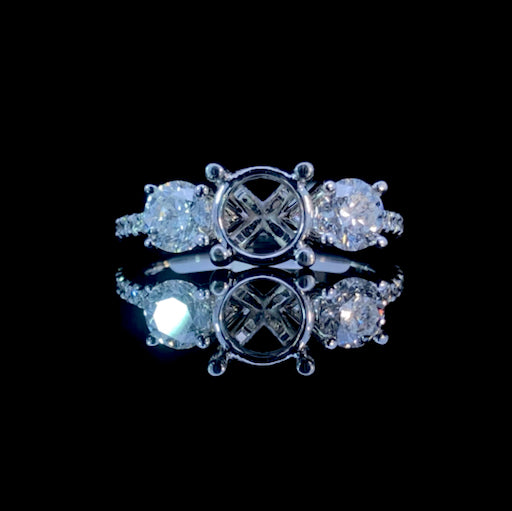 Crafted with exquisite detail in 14kt white gold, this timeless diamond semi mount promises unparalleled luxury. With a generous .50ctw of larger side stones to accent the center stone of choice, and additional .24ctw of round diamonds cascading down the bad, it offers a glittering finish that will dazzle from every angle with 1.24ctw of diamonds. Price is for the semi mount only. Center stone will be added at an additional cost. This ring is a size 6.5. If that size is not a perfect fit, first time sizing is free at the time of purchase. Additional sizing fees may apply.