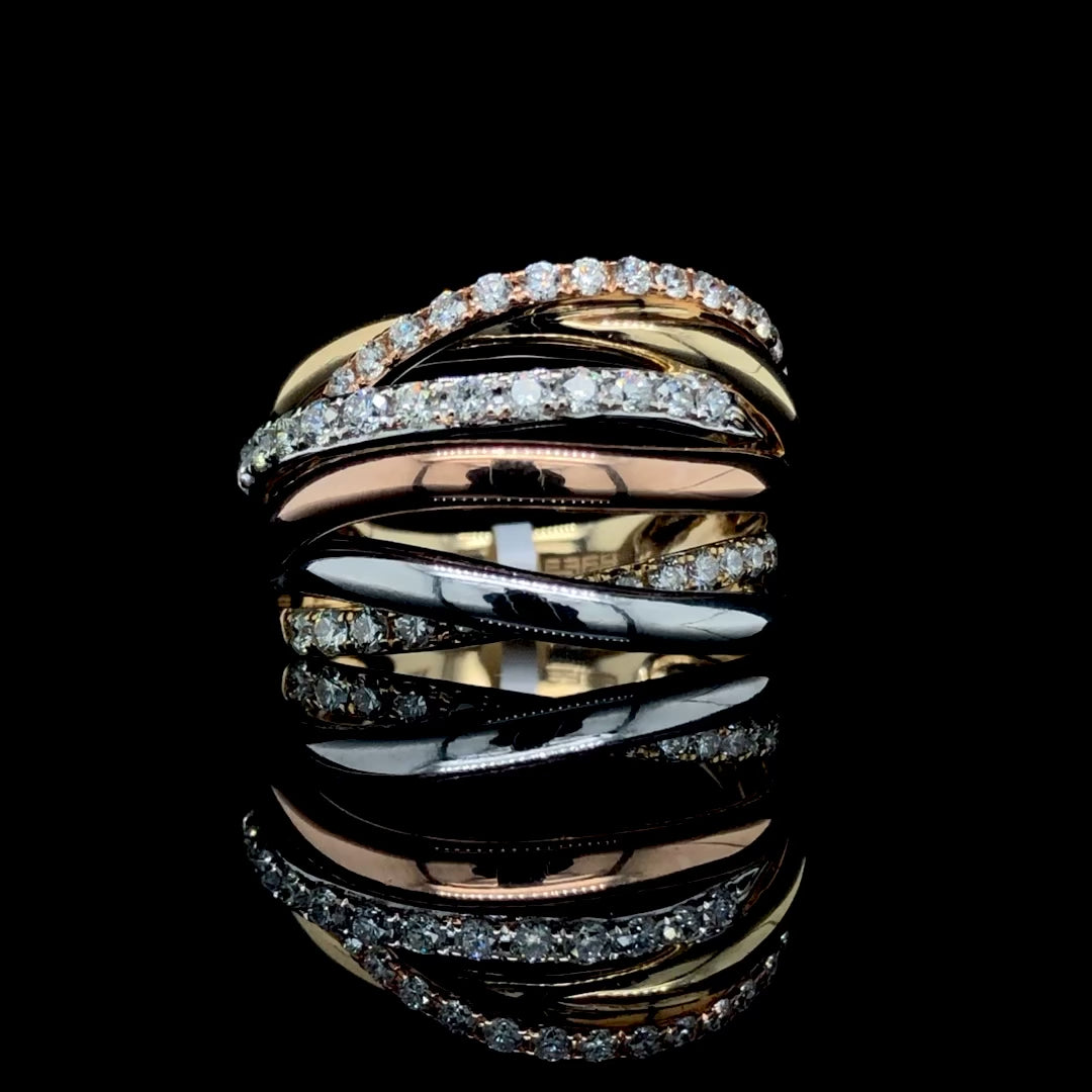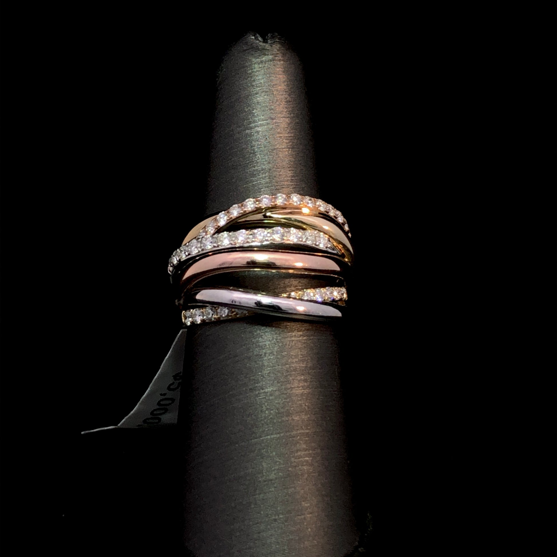 Experience the elegance and style of this 14kt tri-color multi-row band. Featuring 3 rows of diamond bands for a sparkling .67ctw total weight, and 3 plain bands of varying colors, this stunning piece will have you looking and feeling like royalty! This ring is a size 7. If that size is not a perfect fit, first time sizing is free at the time of purchase.