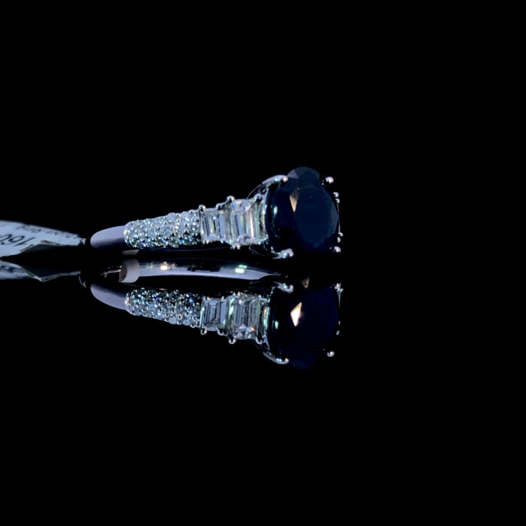 Crafted in lustrous 14 kt white gold, this exquisite ring features a breathtaking 1.42 ct oval sapphire, surrounded by emerald-cut side stones and sprinkled with .33 ctw of shimmering diamonds that adorn the band. Perfect for the woman who appreciates timeless luxury. This ring is a size 7. If that size is not a perfect fit, first time sizing is free at the time of purchase.