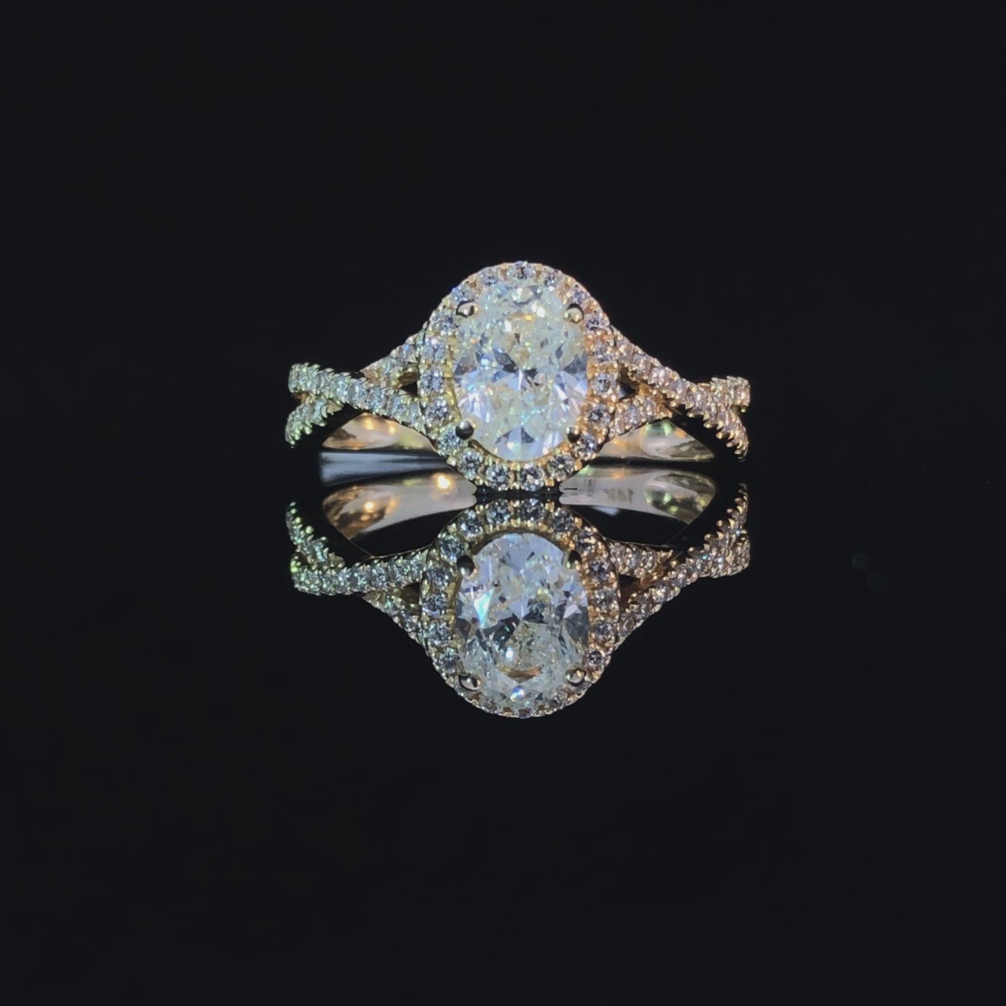 A beautiful 1.01 ct oval diamond takes center stage in this 14 kt yellow gold ring. Further enhanced by a halo and twisted split shank band of .36 ctw of diamonds, this piece is sure to turn heads wherever you go! This ring is a size 7.25. If that size is not a perfect fit, first time sizing is free at the time of purchase.