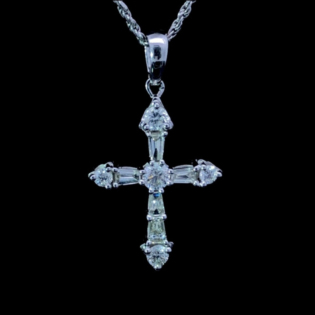This classic design features .38 ctw of round diamonds and .30 ctw of tapered baguettes in a sparkling cross. Perfect for expressing faith or making a statement of elegance, this piece is sure to light up any look. Chain is not included.