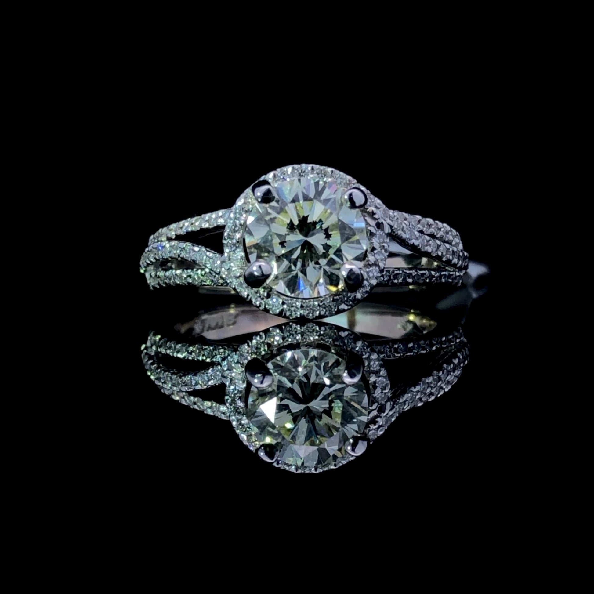 Fall in love with this stunning 14kt white gold ring. The center stone is a dazzling 1.32ct round diamond and is surrounded by a halo of smaller stones for a total diamond weight of 1.68ctw. Flowing from the halo is a unique split shank, artfully decorated with diamonds. A breathtaking piece, perfect for any occasion! This ring is a size 6. If that size is not a perfect fit, first time sizing is free at the time of purchase.