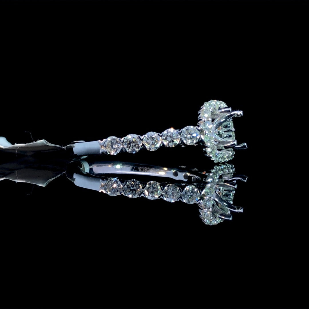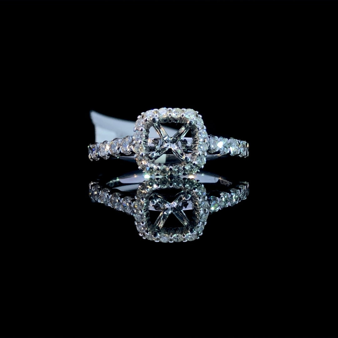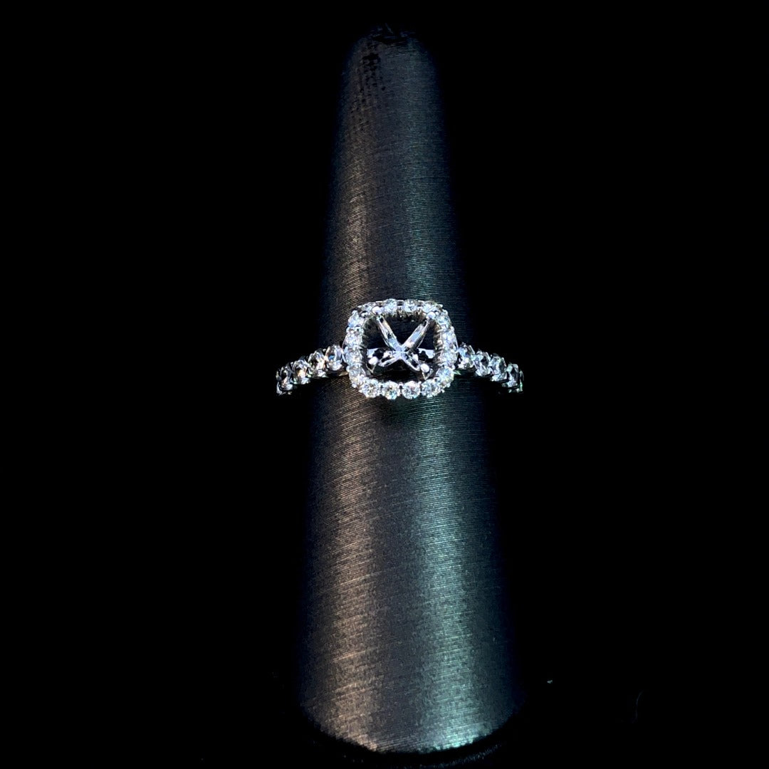 Elevate your style with our classic diamond semi mount! Featuring a cushion shaped halo and cascading diamonds on the band, this 14kt white gold piece exudes elegance. Add your own touch by selecting a center stone from our unbeatable selection. Sparkle in 0.84ctw of round diamonds. Price is for the semi mount only. Center stone will be added at an additional cost. This ring is a size 7. If that size is not a perfect fit, first time sizing is free at the time of purchase. Additional sizing fees may apply.