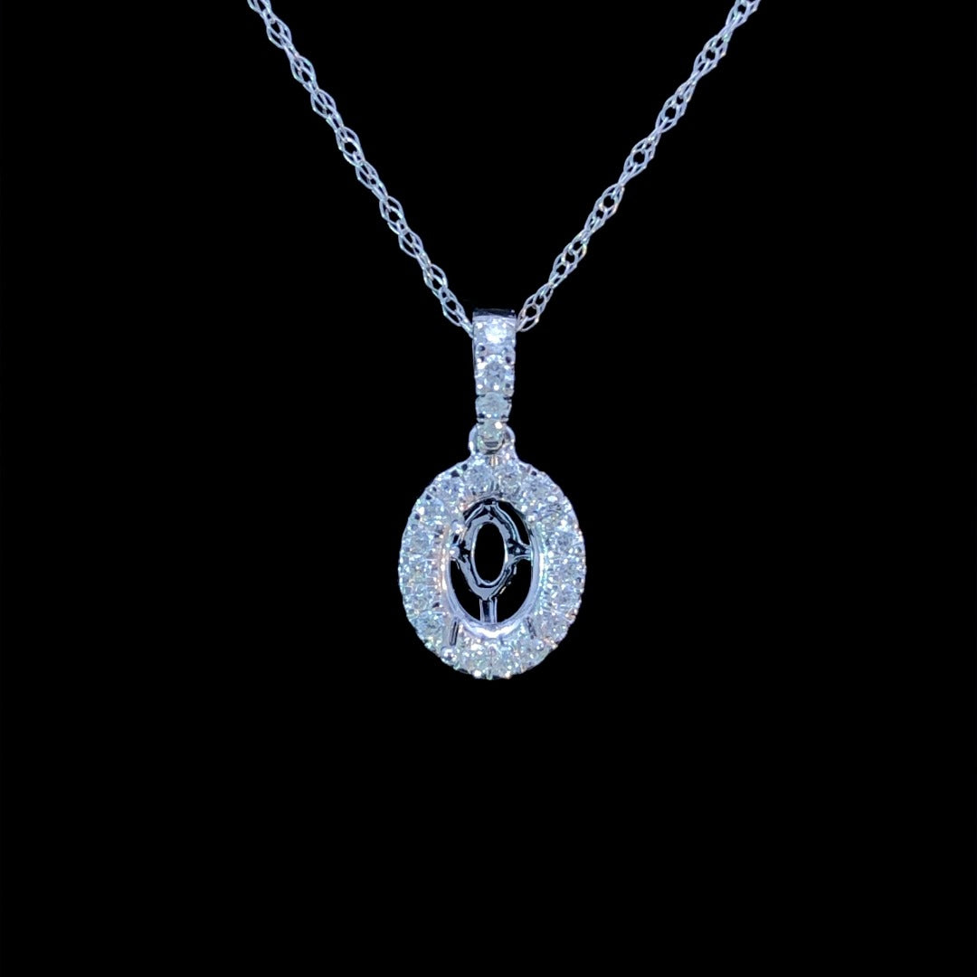 This stunning 14kt white gold pendant mounting takes modern elegance to a whole new level. The classic oval halo design is enhanced with .19ctw of dazzling round diamonds. Make a lasting impression with this dazzling piece of jewelry! Price is for mounting only. Center stone will be added at an additional cost. Chain is not included.