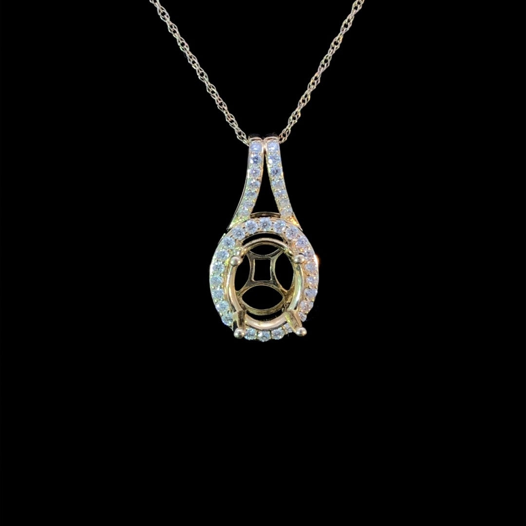 Adorn yourself with opulent elegance! This exquisite pendant mounting features a halo and split bail design encrusted with .25ctw of round diamonds, and an oval shape to hold a stone of your choosing. Capture the beauty of a lifetime with this sparkling wonder! Price is for the mounting only. Stone will be added at an additional cost. Chain is not included.