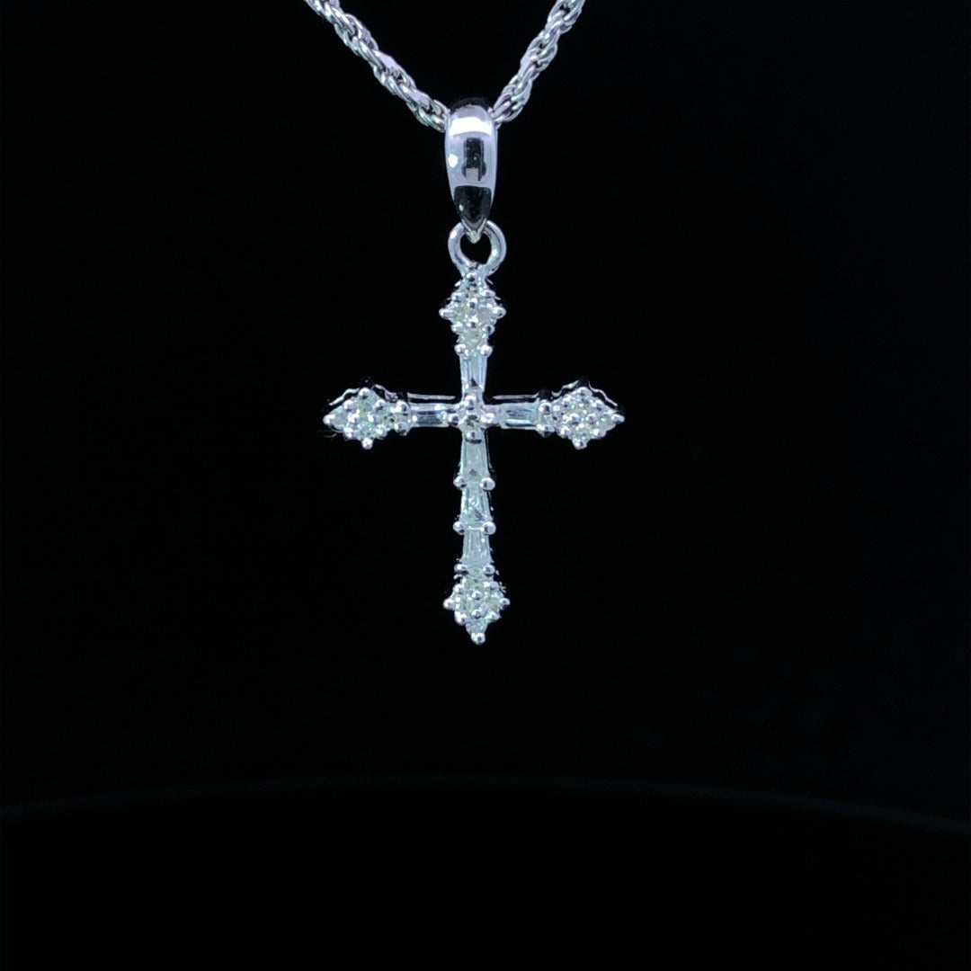 This timeless cross showcases a classic design with .13ctw of diamonds set into 14kt white gold. The combined round and baguette cut diamonds are carefully arranged to form a beautiful piece of jewelry, perfect for any special occasion. Chain is not included.