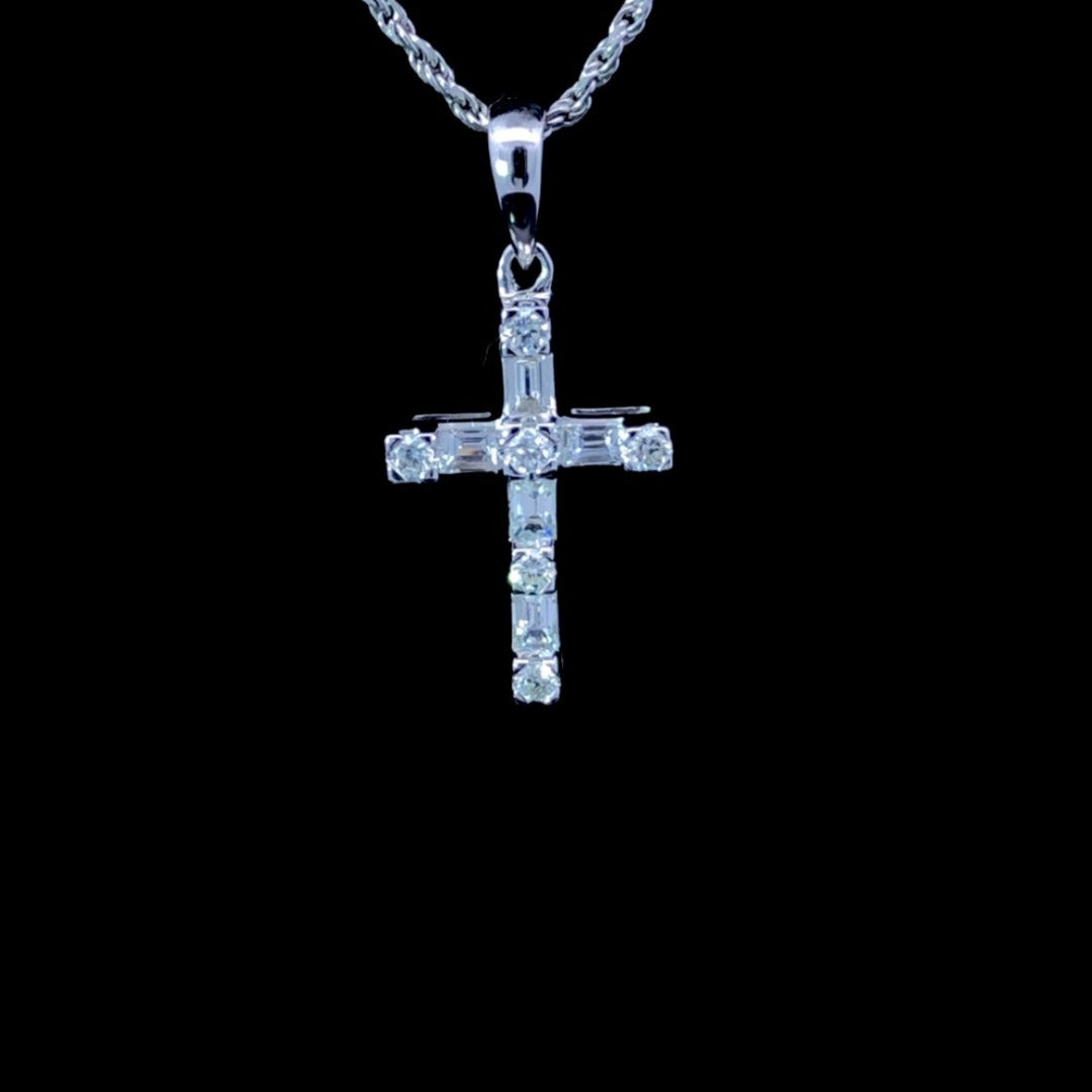 This classic .38ctw diamond cross pendant captures religious sentiment with timeless grace. Set in a secure 14kt white gold frame, round and baguette diamonds shimmer and sparkle with every move. Give your outfits an elegant and meaningful touch. Chain is not included.