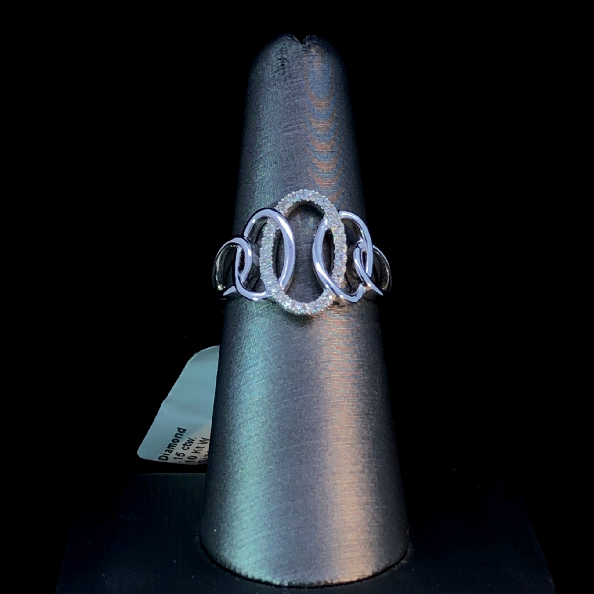 This elegant 10kt white gold ring features a delightful loop design with an oval centerpiece bedecked with .15ctw of dazzling diamonds. Adorn yourself with an exquisite piece of jewelry that will turn heads and make a lasting impression! This ring is a size 7. If that size is not a perfect fit, first time sizing is free at the time of purchase. Additional sizing fees may apply.