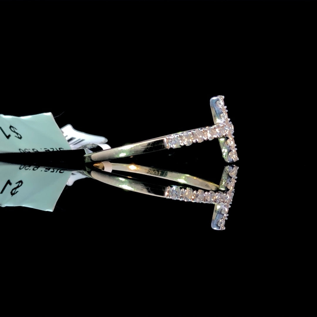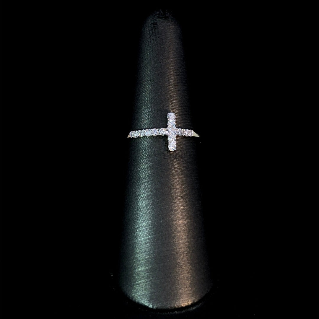 Add a touch of faith and style with this chic diamond ring. The unique east to west cross design is adorned with .20ctw of sparkling round diamonds, all set in 10kt yellow gold. Perfect for anyone looking for a stylish and meaningful piece of jewelry. This ring is a size 6.5. If that size is not a perfect fit, first time sizing is free at the time of purchase. Additional sizing fees may apply.