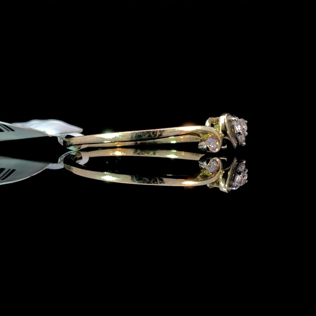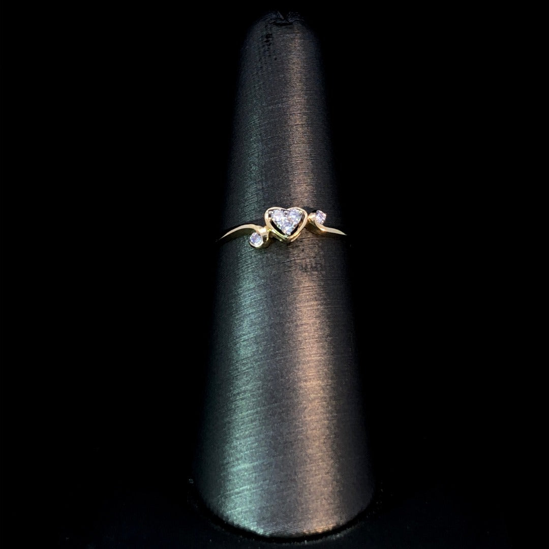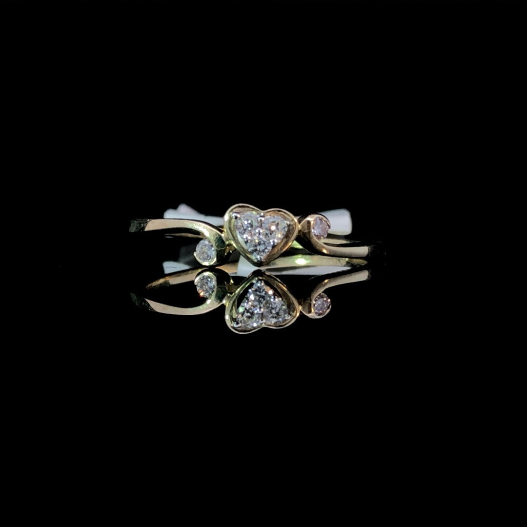 This 14kt yellow gold heart ring is adorned with .09ctw of sparkling round diamond accents, adding a touch of elegance to any outfit. Expertly crafted with a cute and fashionable design, this ring is perfect for adding a charming touch to your everyday look. This ring is a size 6.5. If that size is not a perfect fit, first time sizing is free at the time of purchase. Additional sizing fees may apply.