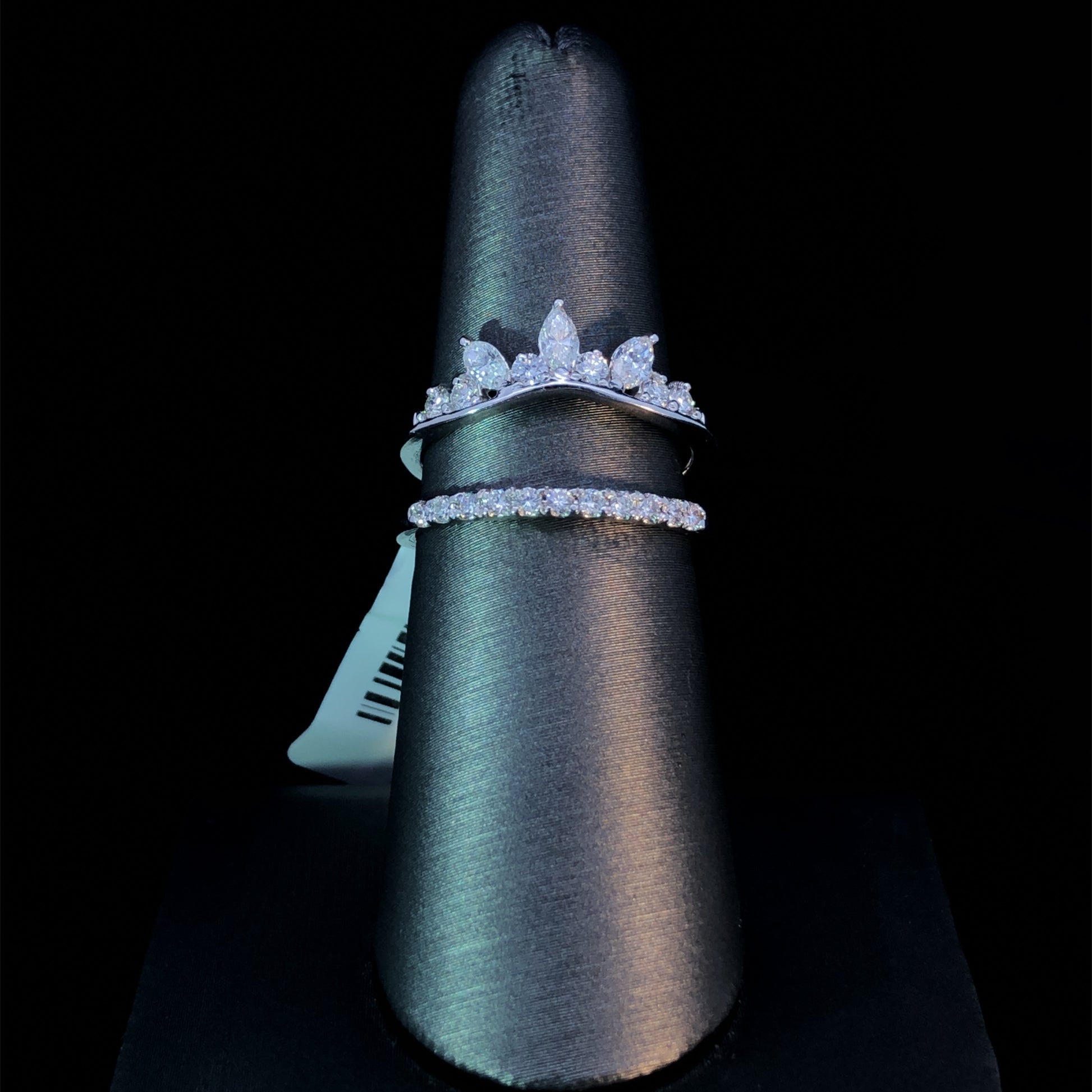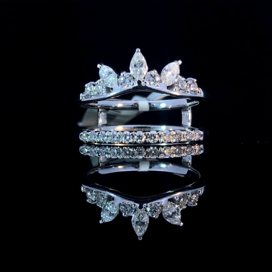 This stunning ring guard showcases the peak of luxury and elegance with .82ctw of carefully chosen round and marquise-shaped diamonds set in 14kt white gold. Its sophisticated style is perfect for adding a touch of refinement and luxury to any look. This ring is a size 7. If that size is not a perfect fit, first time sizing is free at the time of purchase. Additional sizing fees may apply.