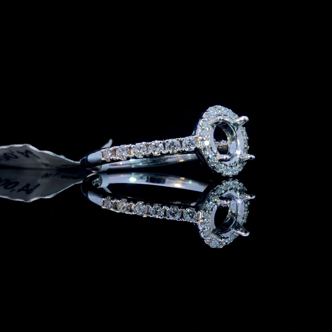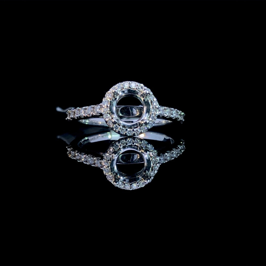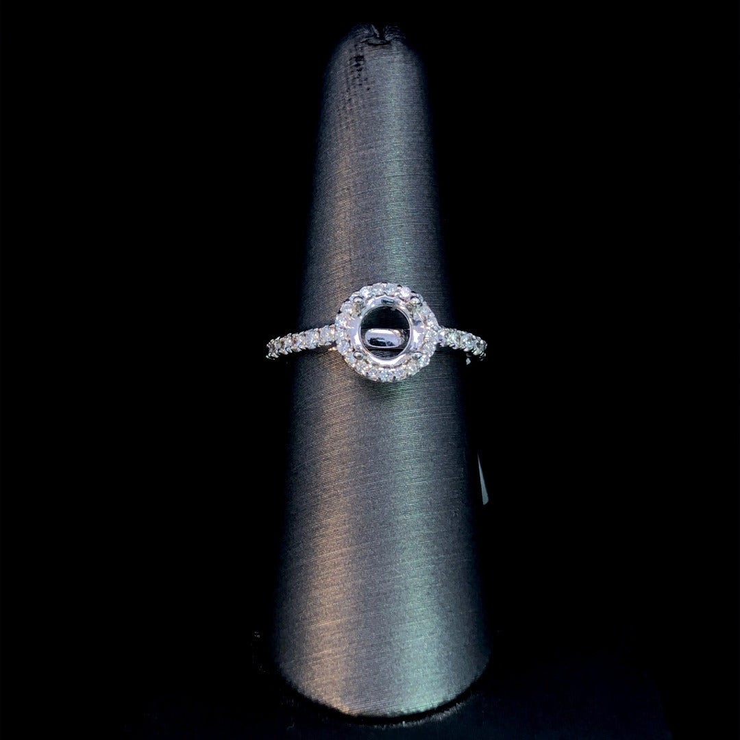 Expertly crafted and timeless, our gorgeous diamond semi mount offers a round halo to beautifully frame your chosen center stone. With an additional cascade of round diamonds adorning the band, all set in elegant 14kt white gold, this piece exudes sophistication and luxury with .41ctw of diamonds. Make a statement with this stunning piece from our collection. Price is for the semi mount only. Center stone will be added at an additional cost. This ring is a size 7. If that size is not a perfect fit, first time sizing is free at the time of purchase. Additional sizing fees may apply.