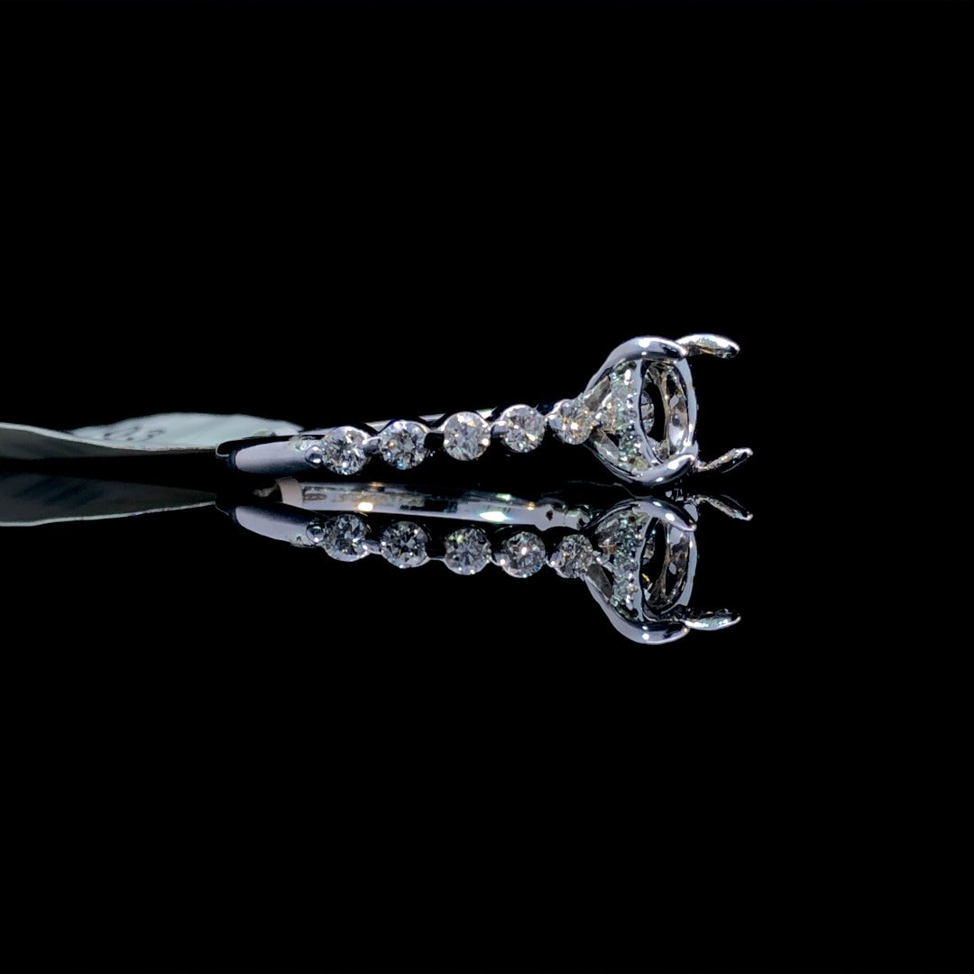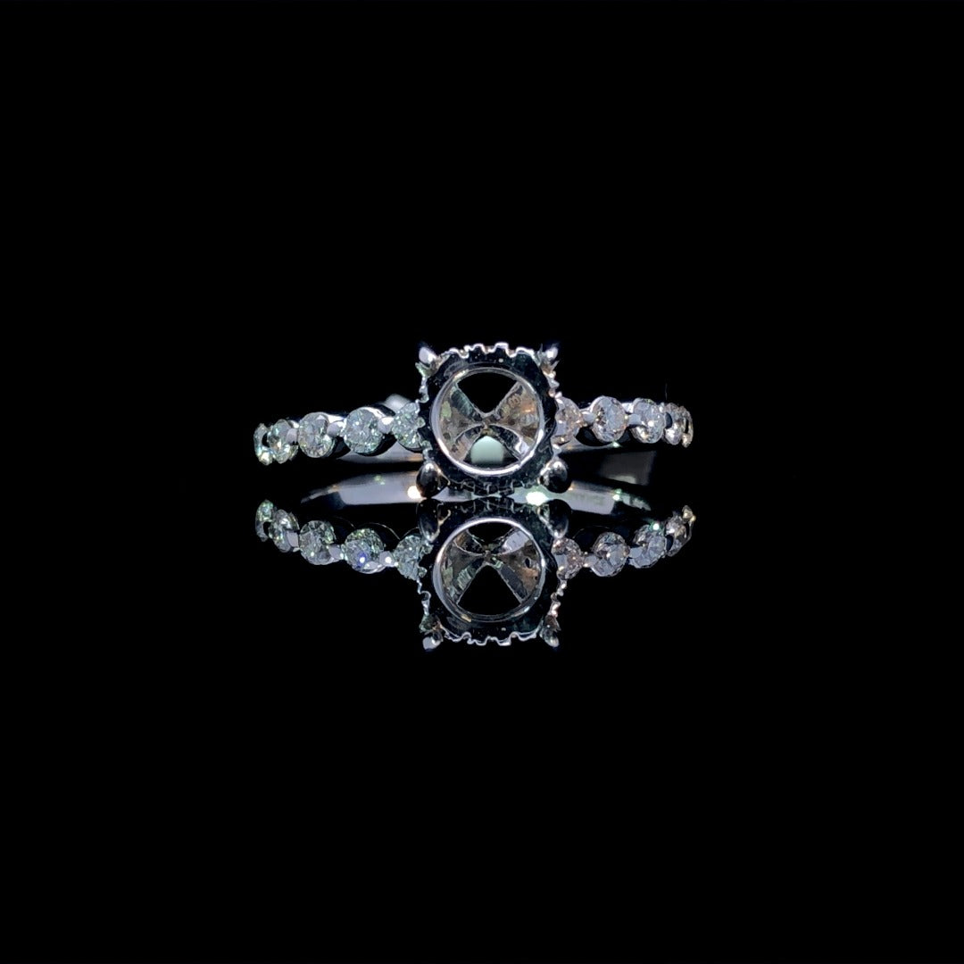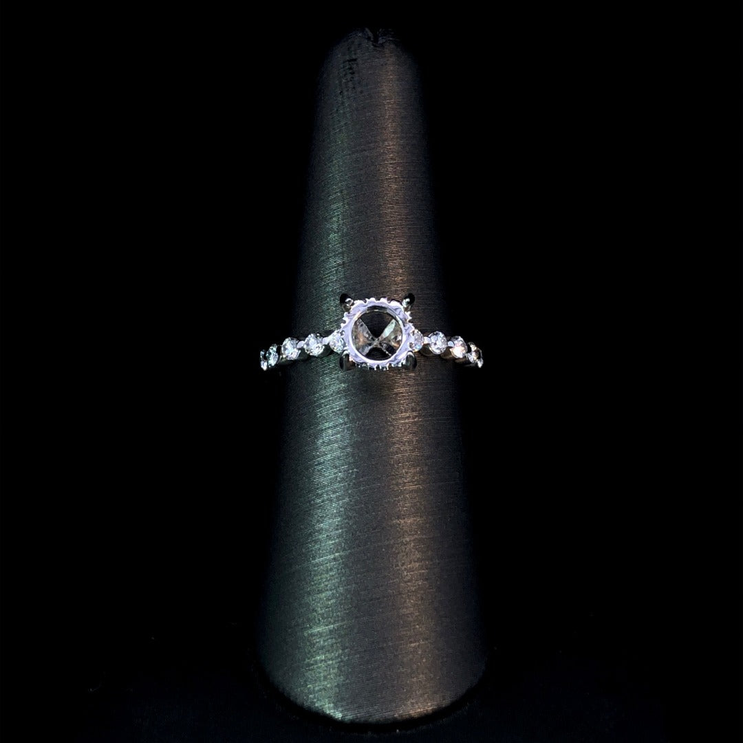 Get ready to shine from every angle with our stunning diamond semi mount! The round head and hidden halo give a chic touch, while the round diamonds on the band add extra sparkle. Made with 14kt white gold, this .41ctw diamond piece is perfect for showcasing your chosen round center stone from our collection. Price is for the semi mount only. Center stone will be added at an additional cost. This ring is a size 7. If that size is not a perfect fit, first time sizing is free at the time pf purchase. Additional sizing fees may apply.