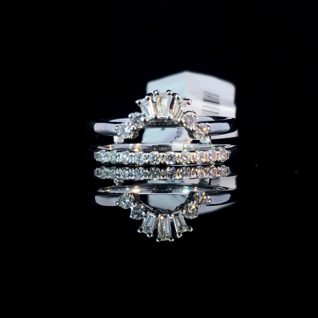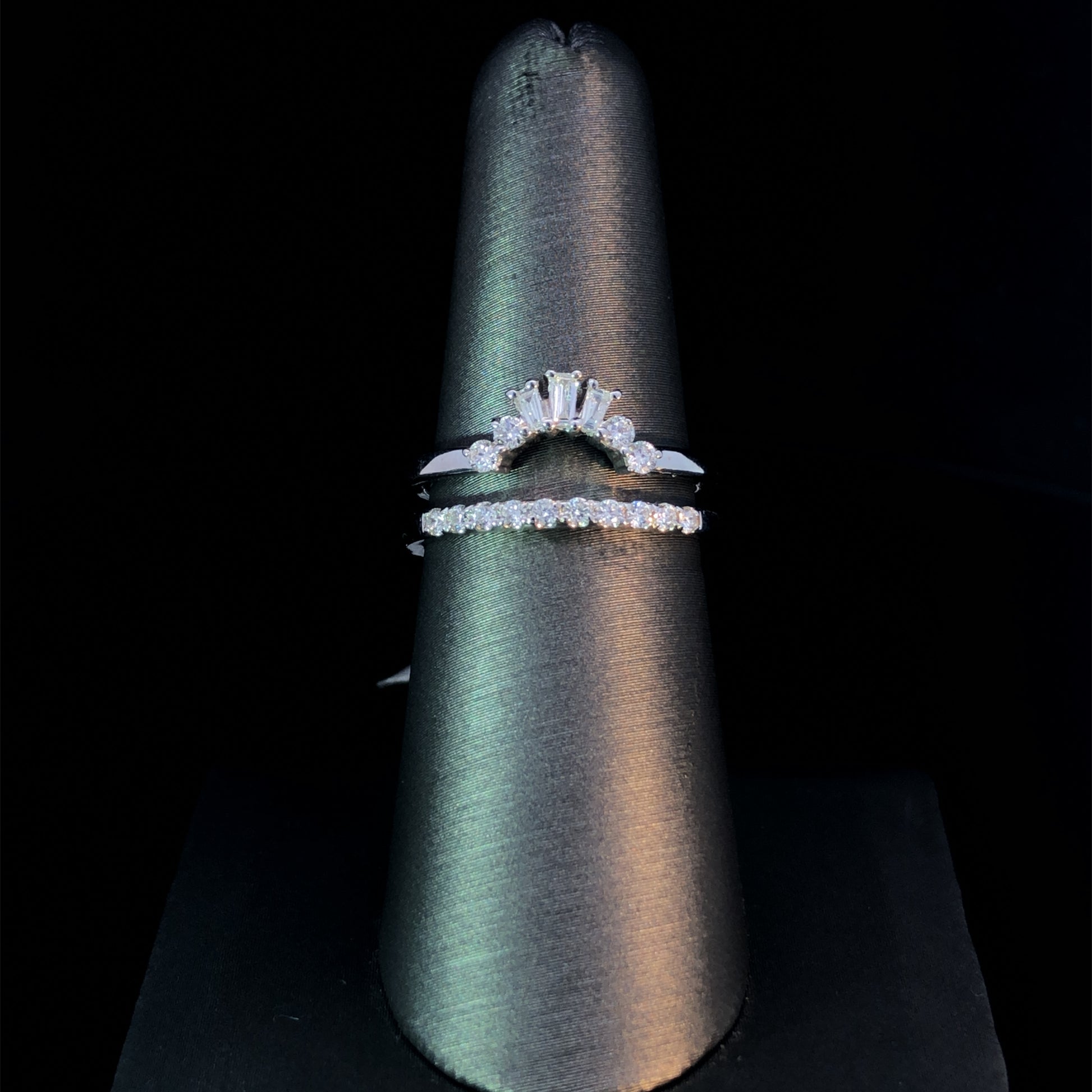 This luxurious ring guard captivates with its .39ctw of dazzling diamonds set in 14kt white gold. One side of the band features an elegant row of round diamonds, while the other side boasts baguette diamonds intricately swept into a graceful curve. This unique piece of jewelry is the perfect accent to any diamond ring. This ring is a size 7. If that size is not a perfect fit, first time sizing is free at the time of purchase. Additional sizing fees may apply.
