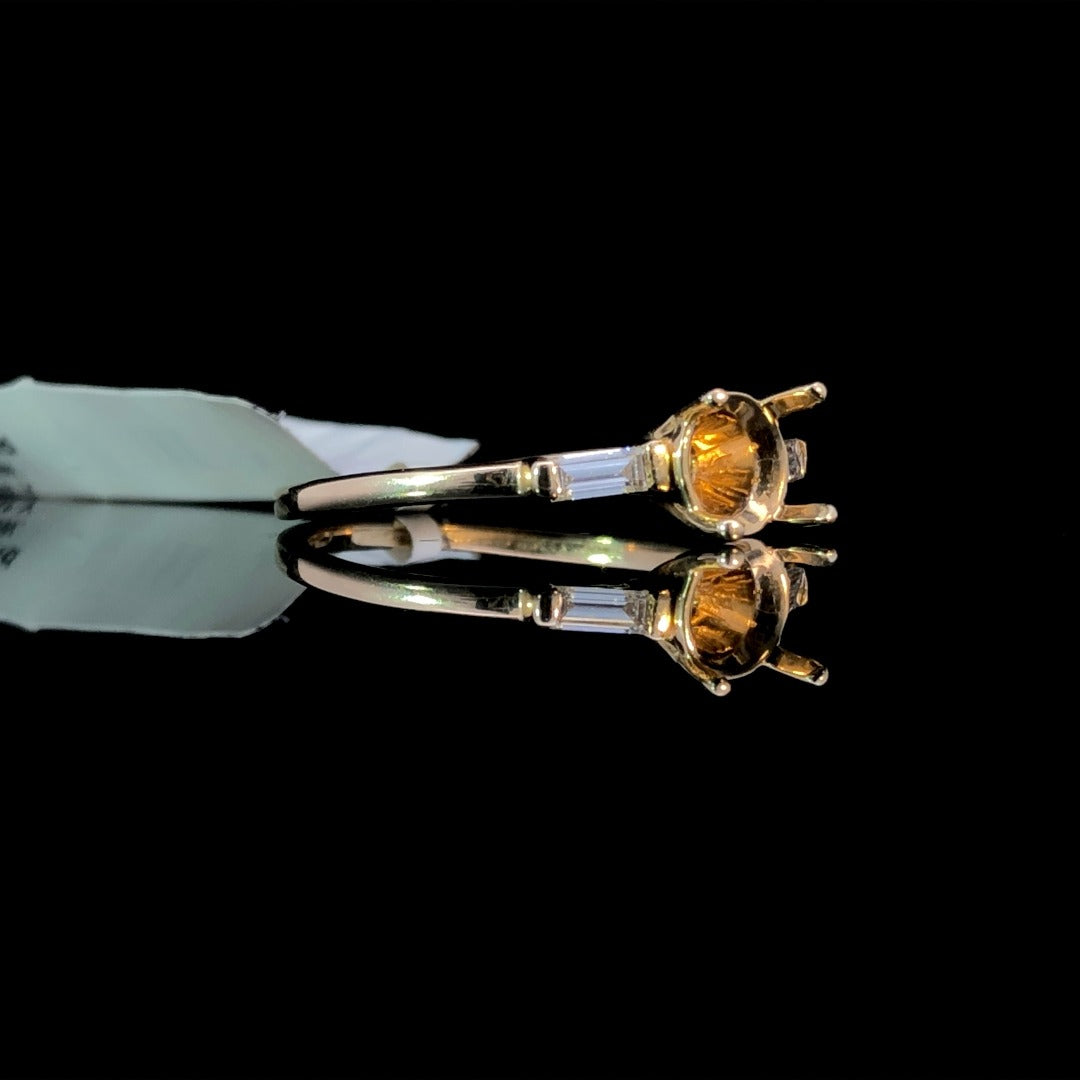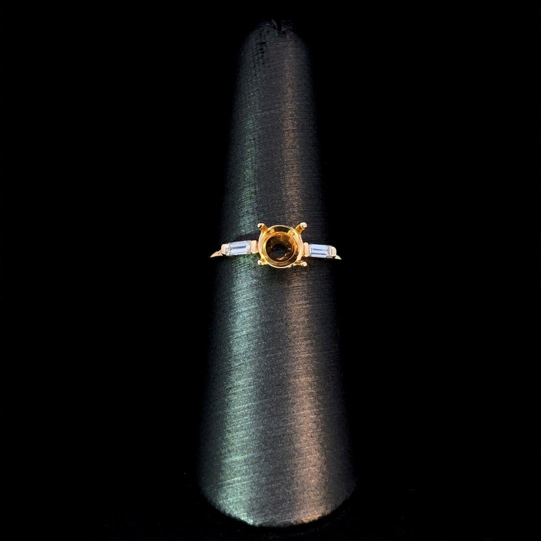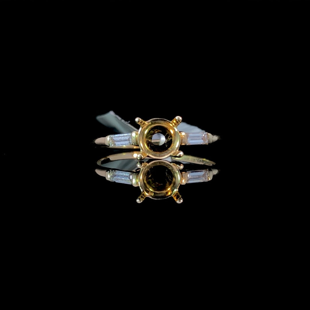 Experience timeless elegance with this gorgeous diamond semi mount. This exquisite piece features a 14kt yellow gold setting, accented by 2 baguette side diamonds totaling .09ctw. Add your own personal touch with a round center stone of your choice. Elevate your style with this luxurious and sophisticated design. Price is for the semi mount only. Center stone will be added at an additional cost. This ring is a size 7. If that size is not a perfect fit, firs time sizing is free at the time of purchase. Additional sizing fees may apply.