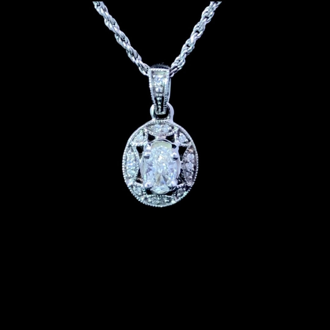 This elegant pendant combines a .19ct exquisite oval diamond set in 14kt white gold filigree with .09ctw of sparkling accents, creating a timeless piece that will add a hint of sophistication to any look. Bring opulence to your wardrobe and upgrade your style with this exquisite pendant. Chain is not included.