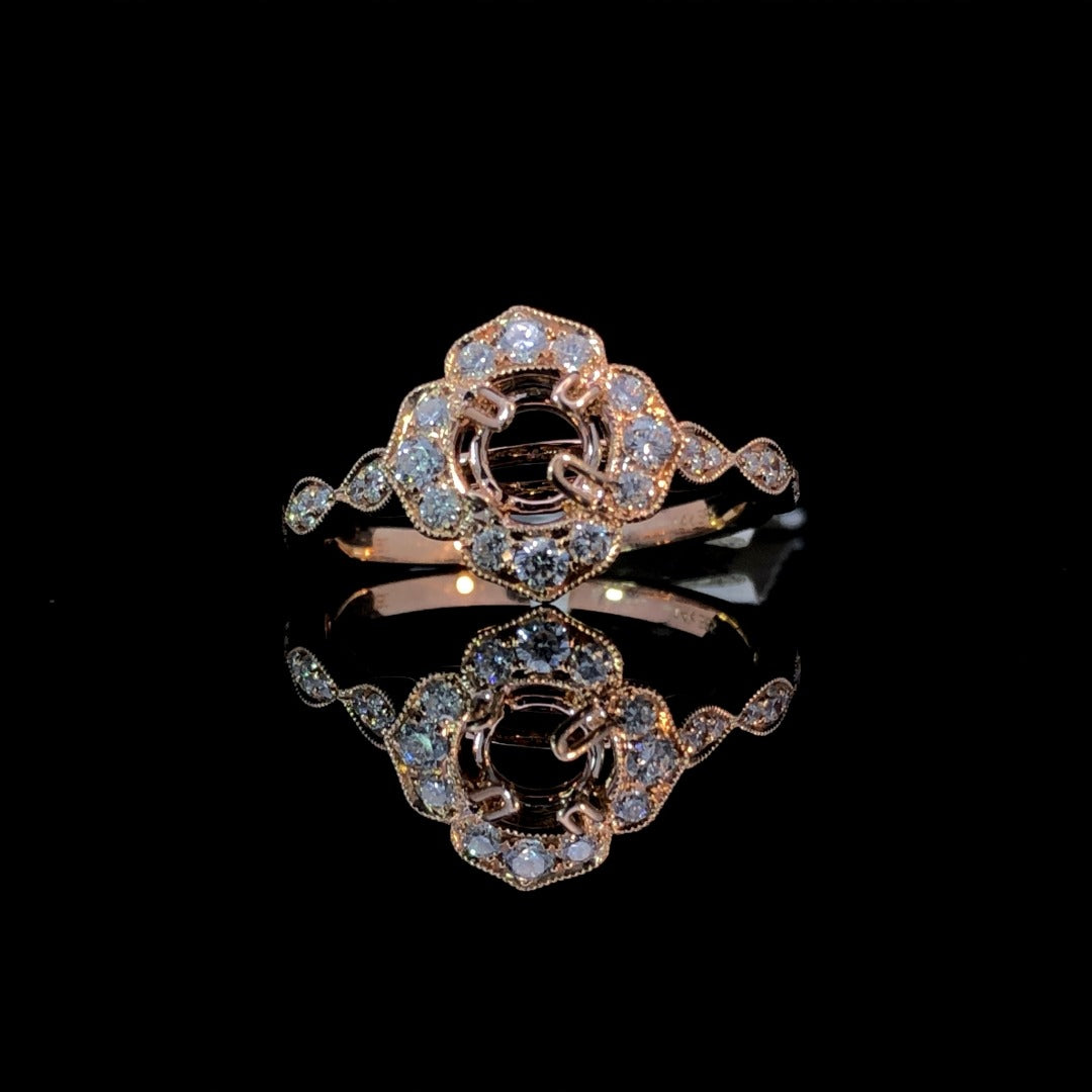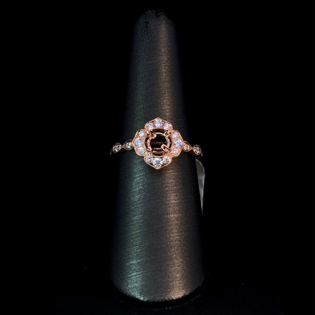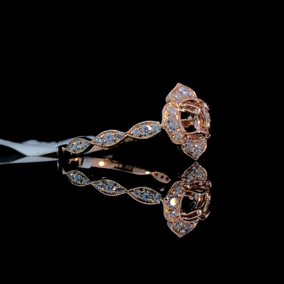 Elevate your style with our gorgeous diamond semi mount. The eye-catching halo and band, adorned with .44ctw of round diamonds and delicate milgrain details in 14kt rose gold, add a touch of glamour. Choose from our exquisite collection of loose stones to create a one-of-a-kind piece that will capture attention. Price is for the semi mount only. Center stone will be added at an additional cost. This ring is a size 7. If that size is not a perfect fit, first time sizing is free at the time of purchase. Additional sizing fees may apply.