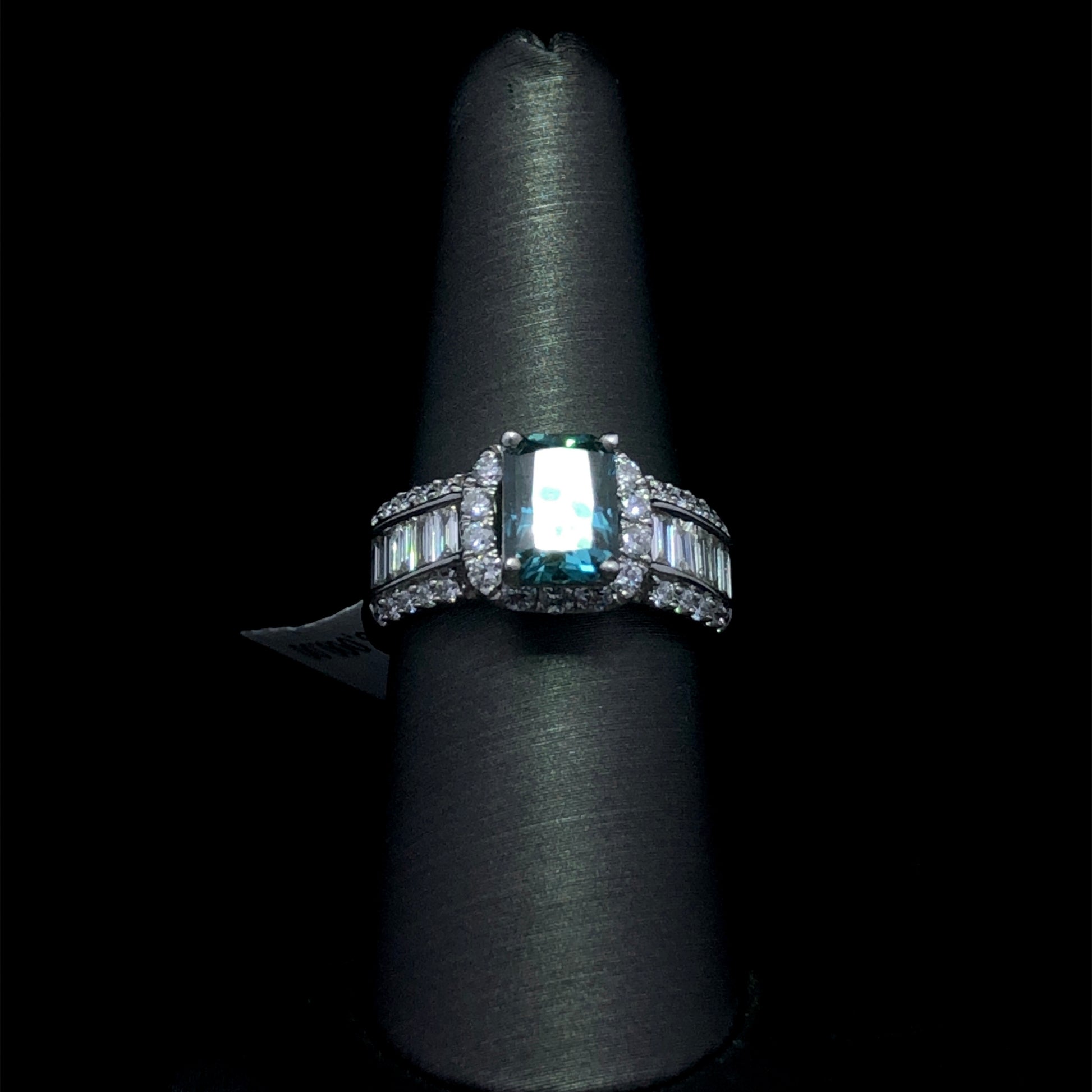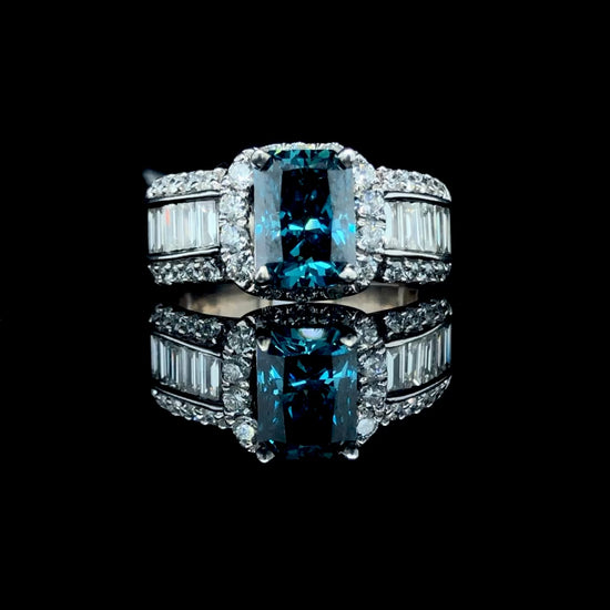 Create a classic look with this dazzling 2.18ct emerald cut treated blue diamond set in 14kt white gold. Accented with 1.36ctw of round and baguette diamonds, this ring showcases a total carat weight of 3.54ctw – perfect for any occasion! Embrace the beauty and sparkle of this timeless piece! This ring is a size 8. If that size is not a perfect fit, first time sizing is free at the time of purchase.