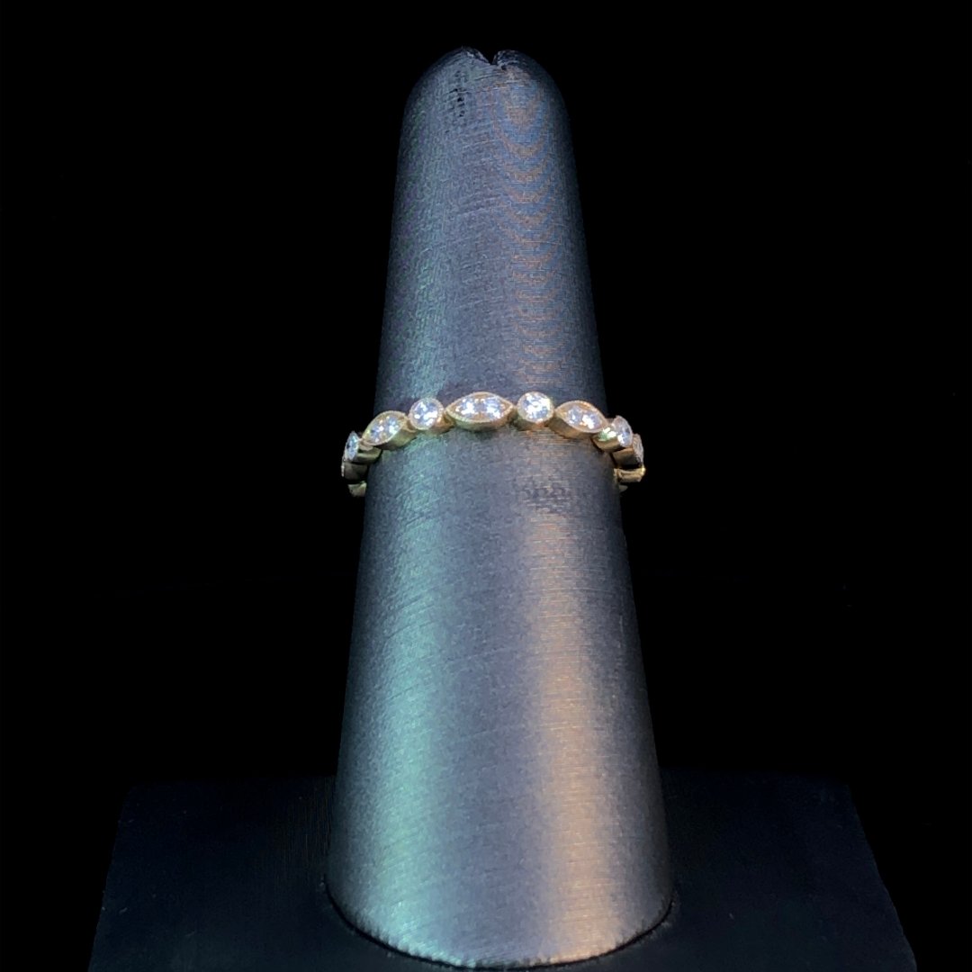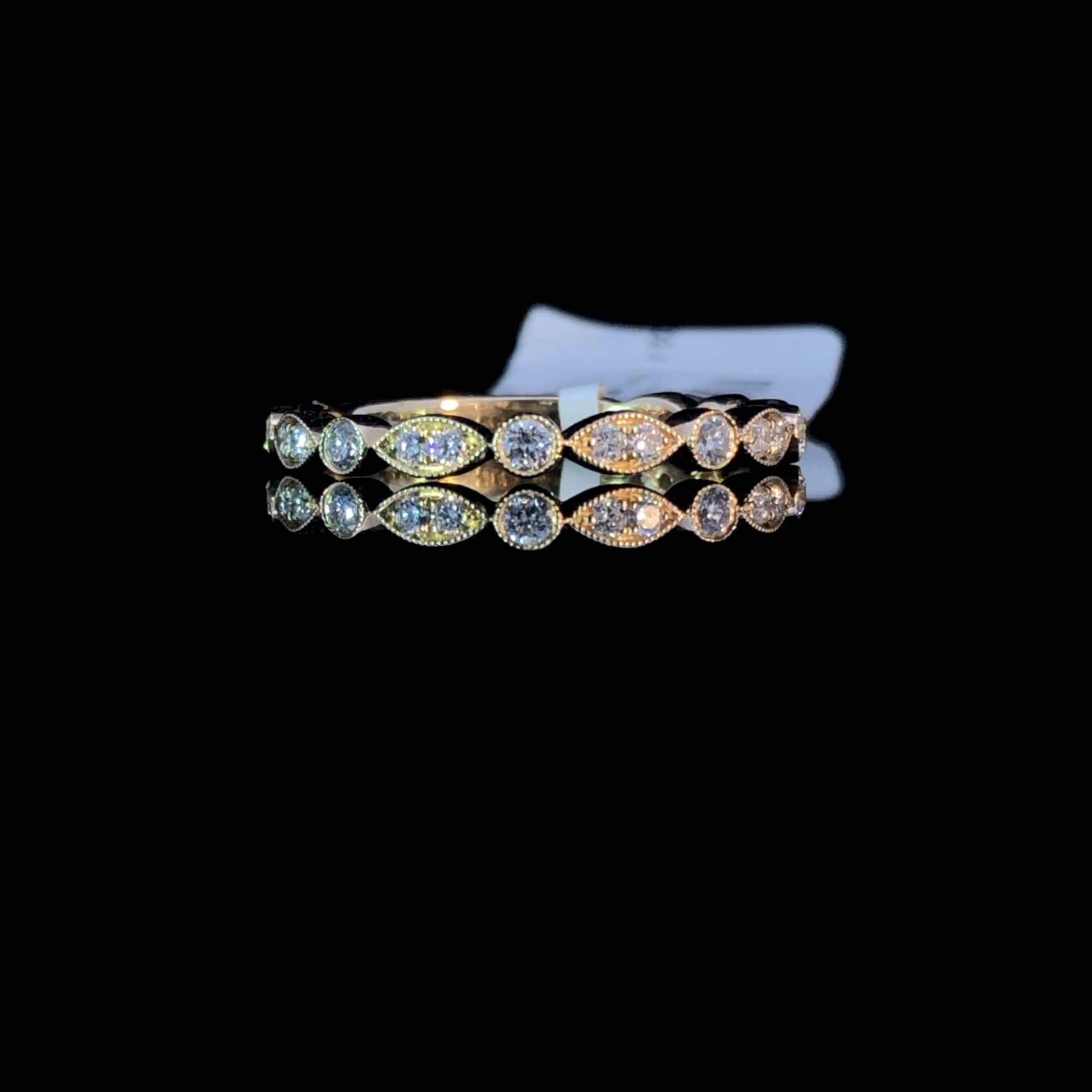 This elegant 14kt yellow gold milgrain band is a unique piece of jewelry, sure to be admired. Featuring .31ctw of round diamonds set artfully in alternating shapes, it is sure to make a stylish statement to any outfit. An exclusive choice, perfect for contemporary accessorizing. This ring is a size 6.5. If that size is not a perfect fit, first time sizing is free at the time of purchase. Additional sizing fees may apply.