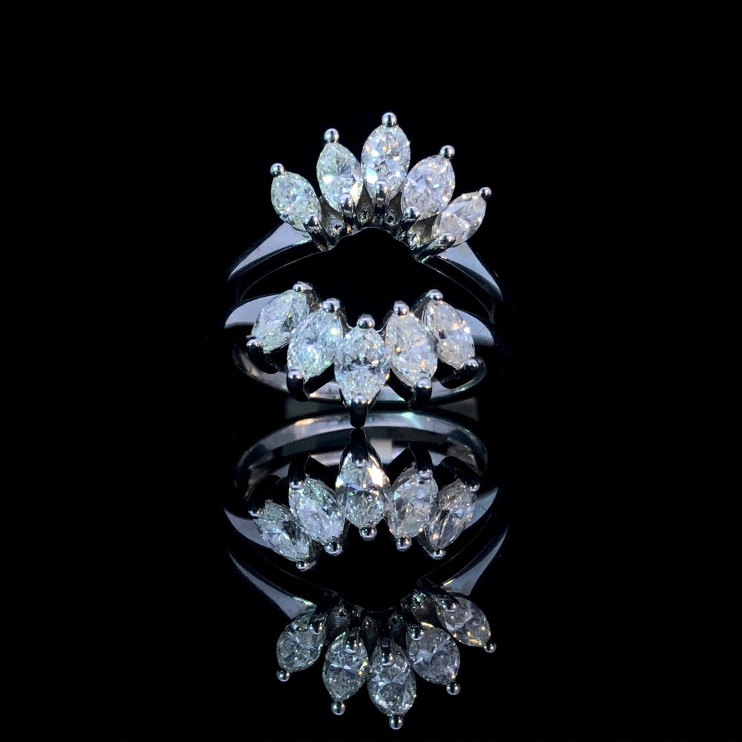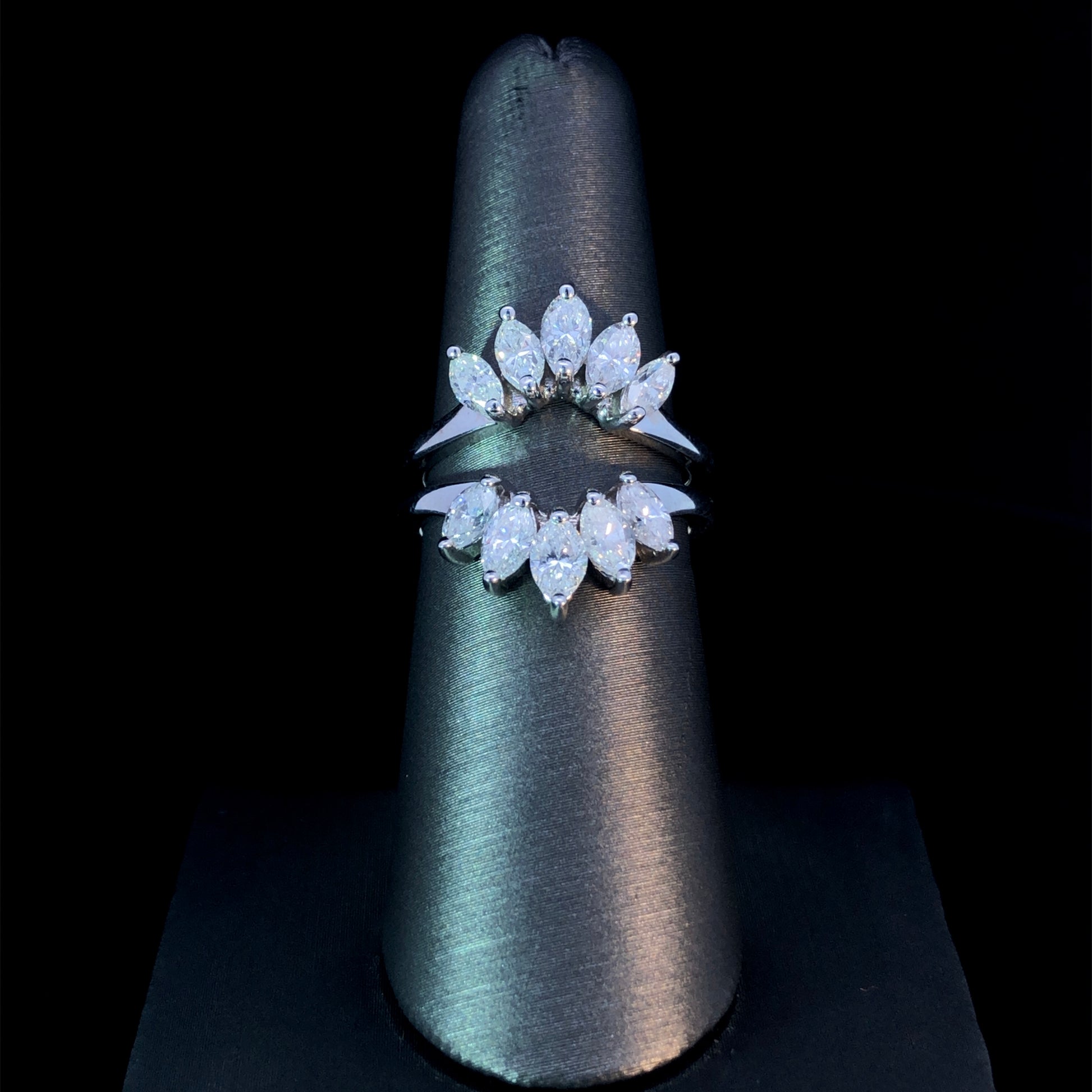 Turn any ring into a stunning statement piece with this beautiful ring guard. Showcasing 2.10ctw of marquise diamonds set in 14kt white gold, it's the perfect way to ensure your ring sparkles with dazzling brilliance. Make a lasting impression with this unique and eye-catching design! This ring is a size 6.75. If that size is not a perfect fit, first time sizing is free at the time of purchase. Additional sizing fees may apply.