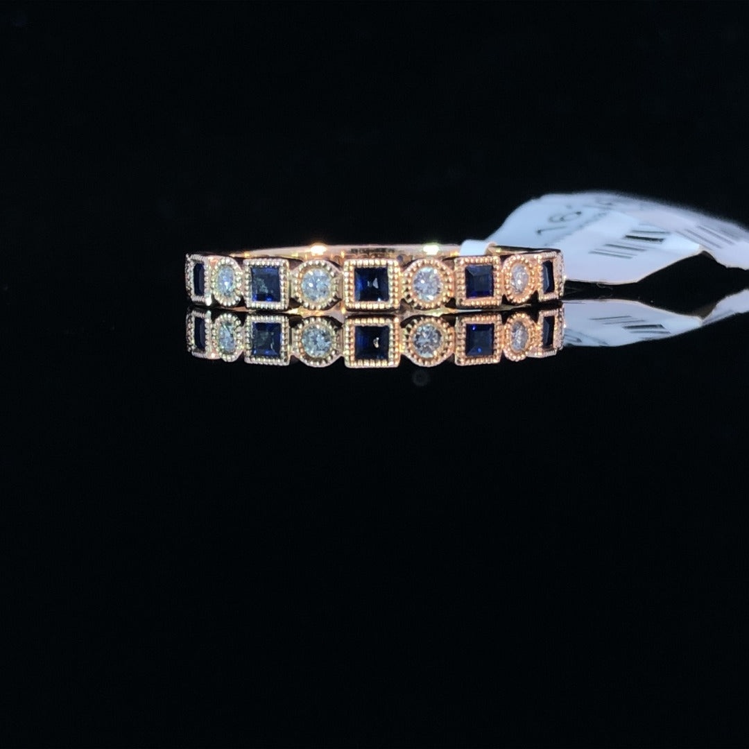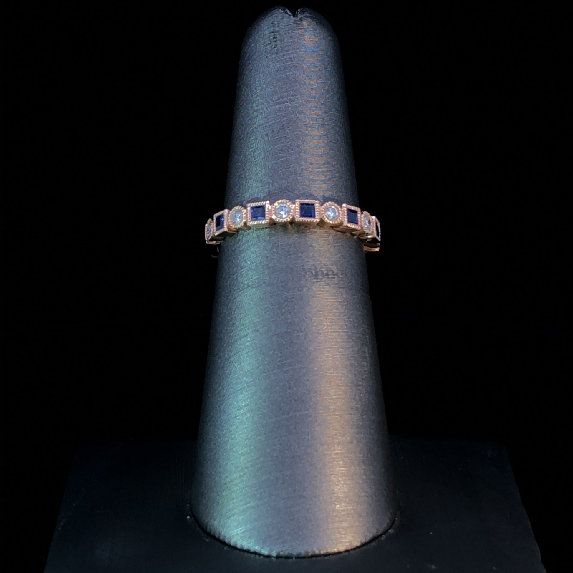 This exquisite decorative band shines with its unique arrangement of .41ctw of diamonds and sapphires set in 14 karat rose gold with milgrain detailing for a timelessly elegant finish. An exquisite jewelry piece made with sophistication and exclusivity; this is the perfect accessory for those with a taste for the finer things in life. This ring is a size 6. If that size is not a perfect fit, first time sizing is free at the time of purchase. Additional sizing fees may apply.