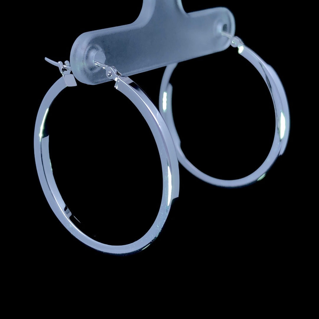 Indulge in the timeless elegance of these 14kt white gold hoops. Crafted with precision, they have a flat design and a polished finish that exudes sophistication and subtle refinement. Enhance your style with these captivating hoops and feel the luxury of premium jewelry.
