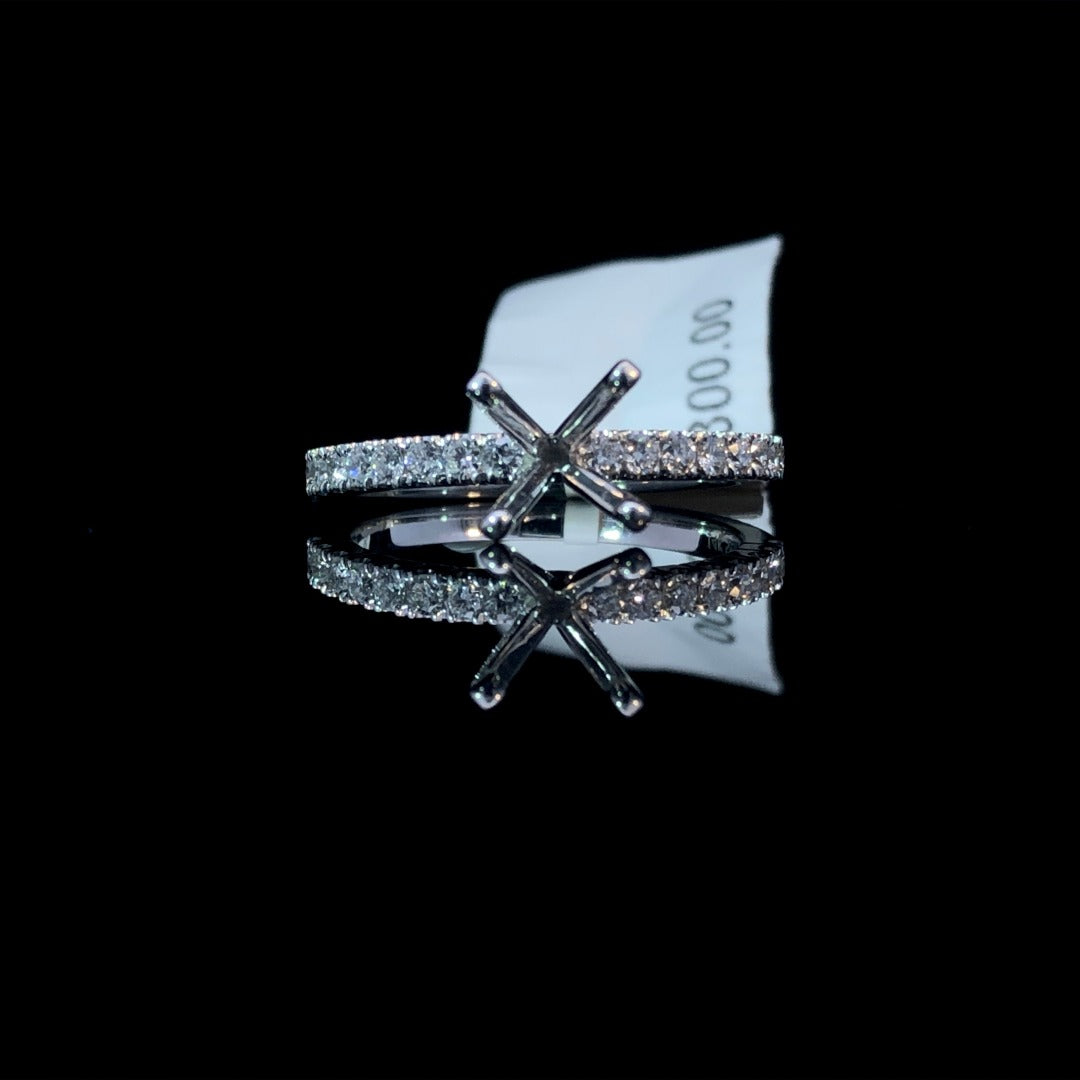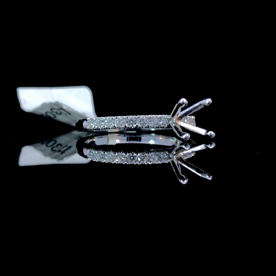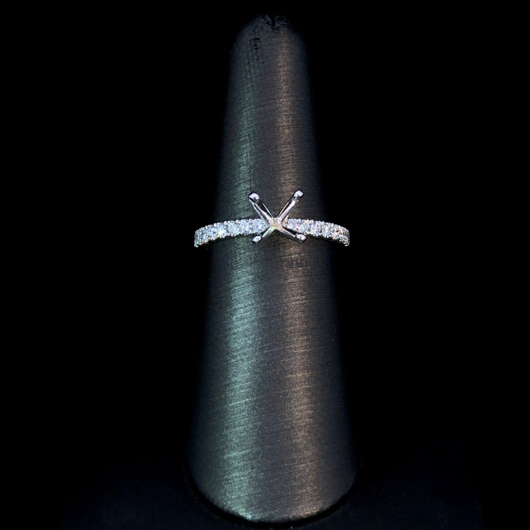 Radiate elegance on your special day with our stunning diamond semi mount. Crafted in 14kt white gold, it features .32ctw of sparkling round diamonds cascading down the band. Choose your own center stone from our wide selection and our expert jewelers will set and size it for you typically within the day. Price is for the semi mount only. Center stone will be added at an additional cost. This ring is a size 6.5. If that size is not a perfect fit, first time sizing is free at the time of purchase. Additional sizing fees may apply.