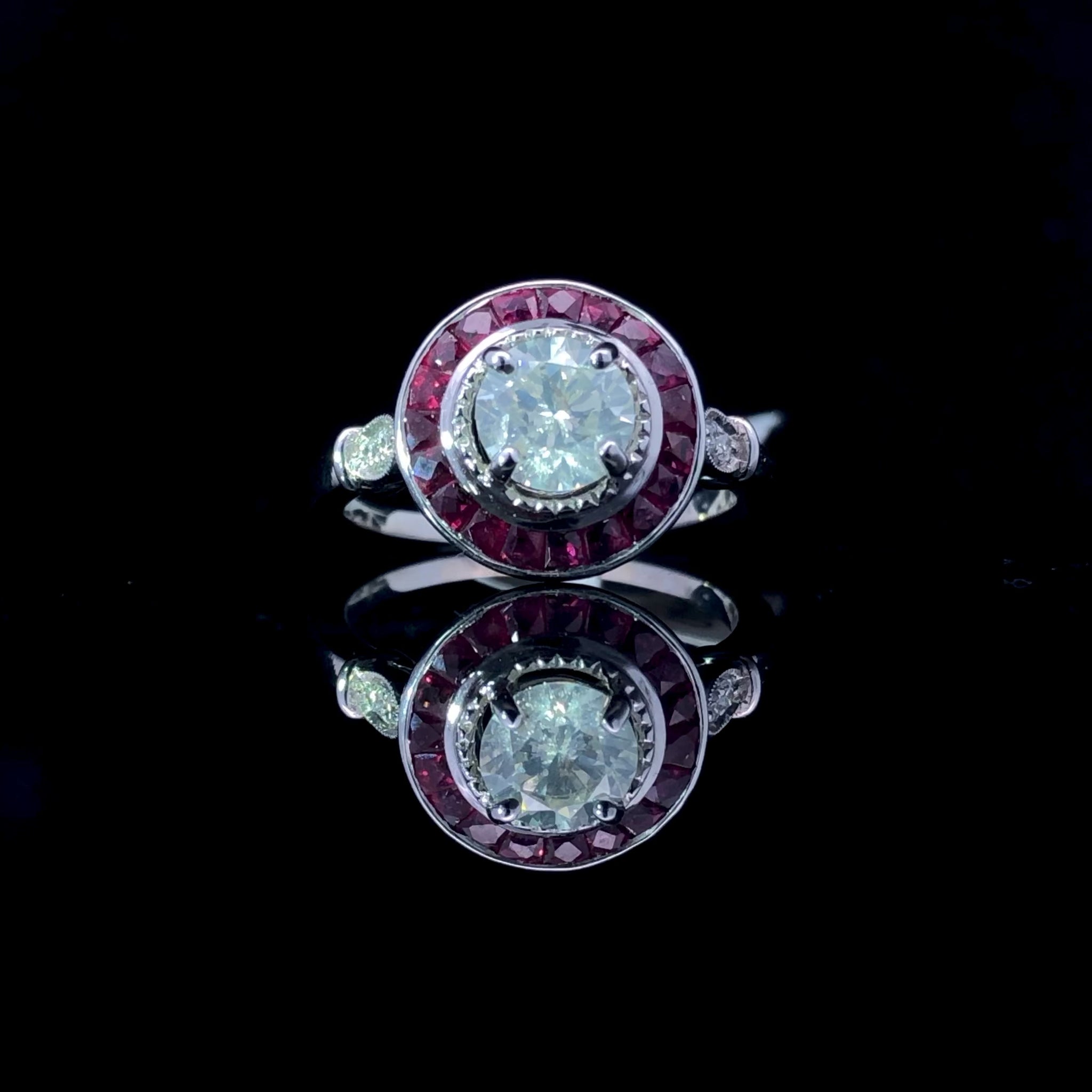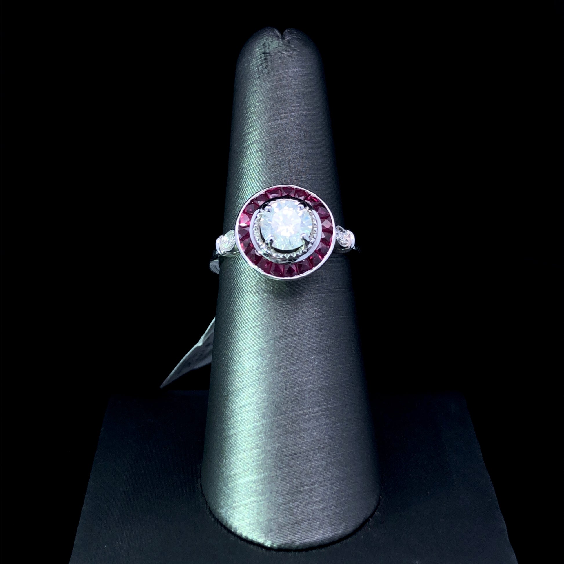 This stunning diamond and ruby ring is a magnificent showstopper! A gorgeous .85ct round diamond surrounded by a halo of rubies and two round diamonds set in 14kt white gold will make you sparkle and shine. Make a statement with this unique and sophisticated piece. This ring is a size 6.5. If that size is not a perfect fit, first time sizing is free at the time of purchase, Additional sizing fees may apply.