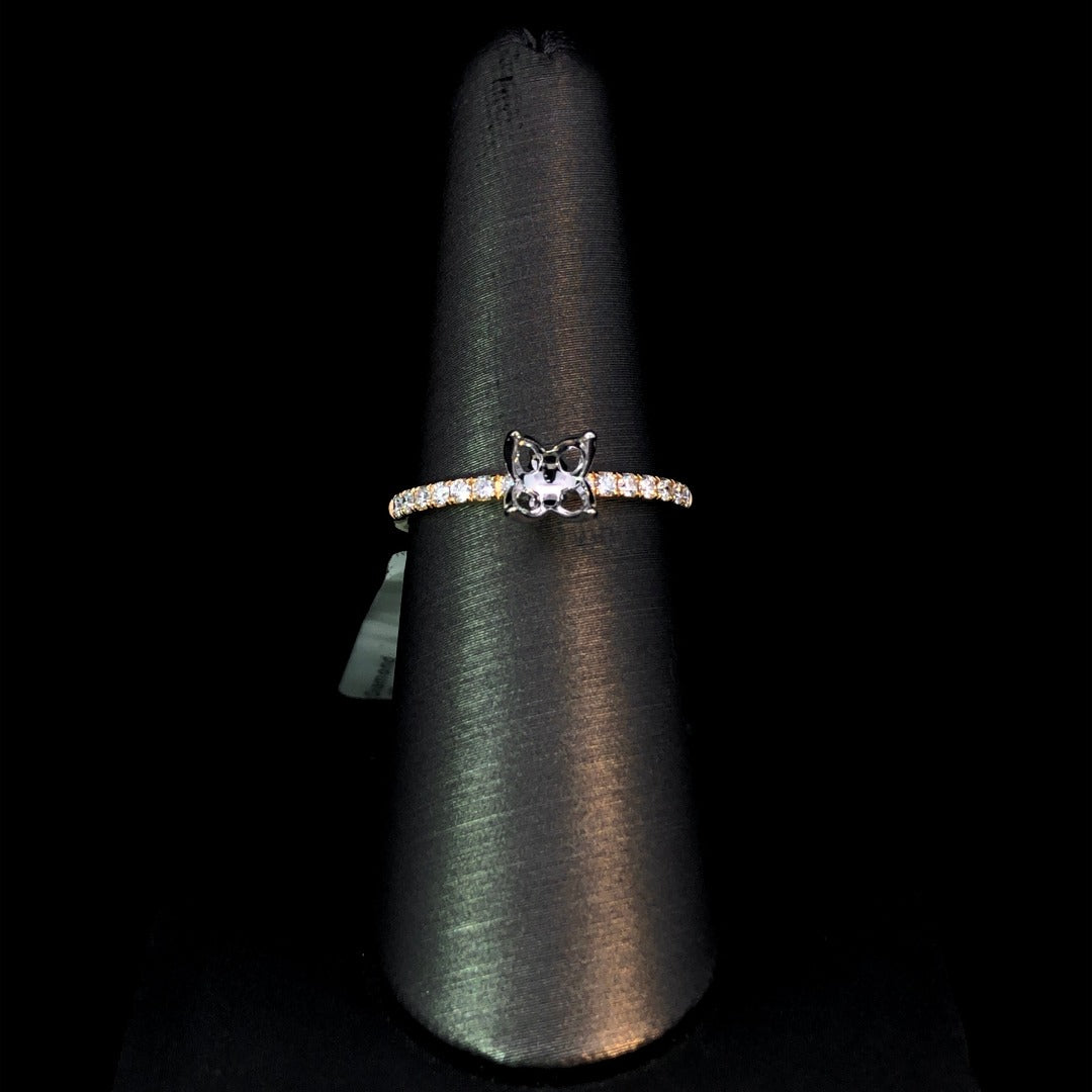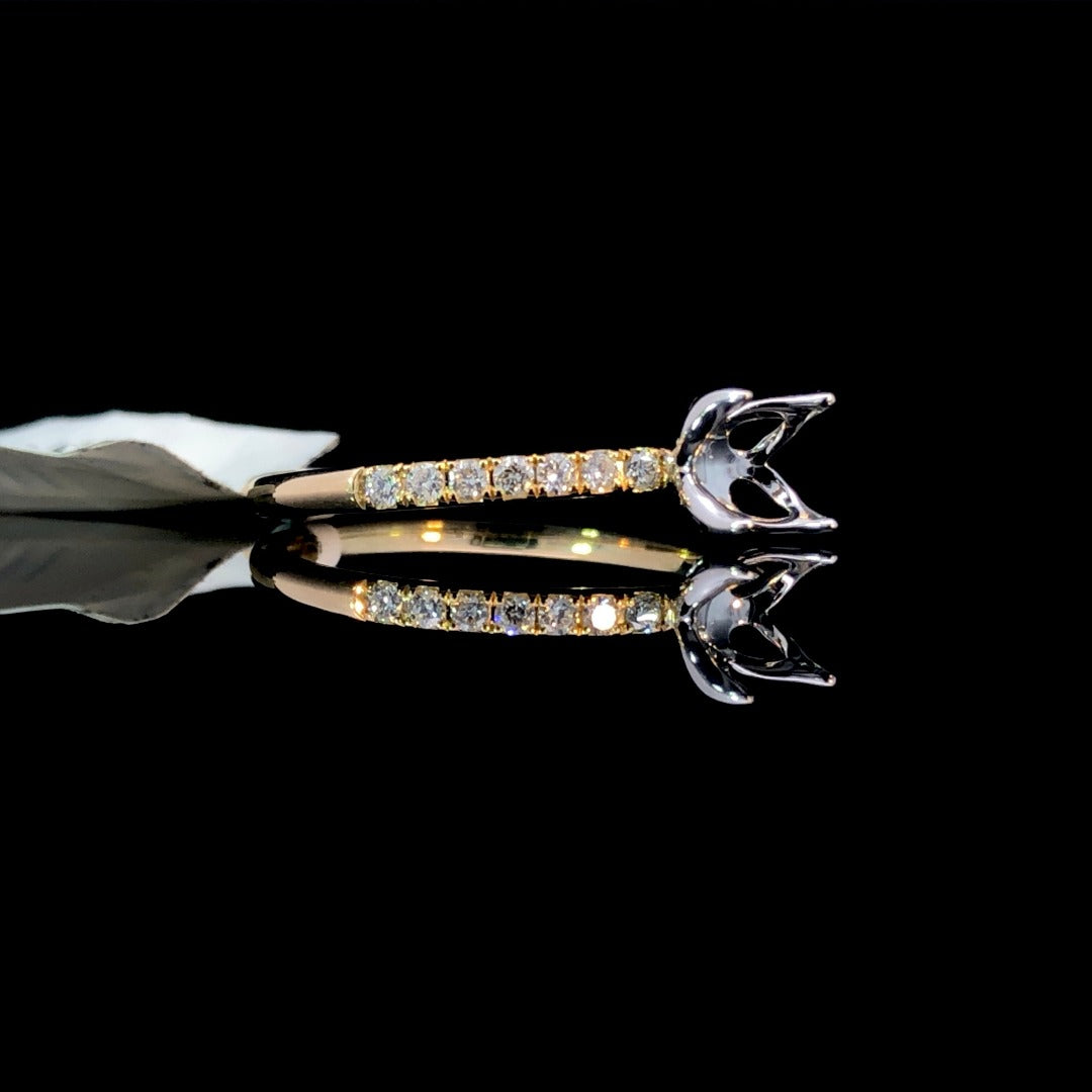 Complete your dream ring with this beautiful semi mount. Featuring a tulip style head in white gold and a 14kt yellow gold band adorned with .18ctw of sparkling round diamonds. Choose your perfect center stone from our collection and make this classic piece uniquely yours! Price is for the semi mount only. Center stone will be added at an additional cost. This ring is a size 6.5. If that size is not a perfect fit, first time sizing is free at the time of purchase. Additional sizing fees may apply.