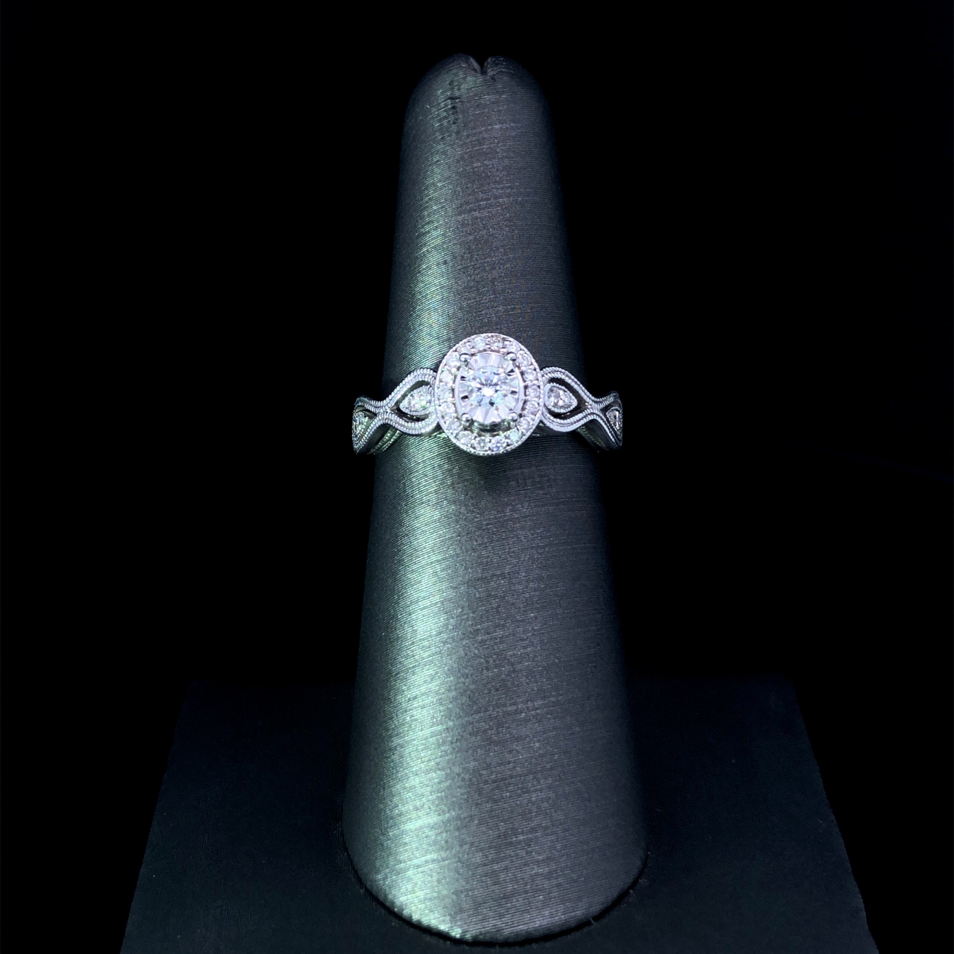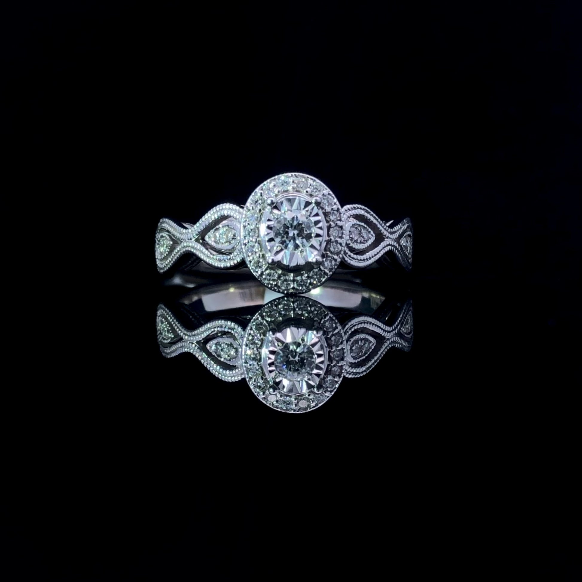 Delicate and luxurious, this unique ring is a timeless expression of sophistication and class. Crafted from 10kt white gold and set with .25 ctw of glittering round diamonds, its illusion style head is accented by a halo and a decorative band for ultimate shimmer and sparkle. A perfect piece for adding an air of glamour and exclusivity to any ensemble. This ring is a size 6. If that size is not a perfect fit, first time sizing is free at the time of purchase. Additional sizing fees may apply.