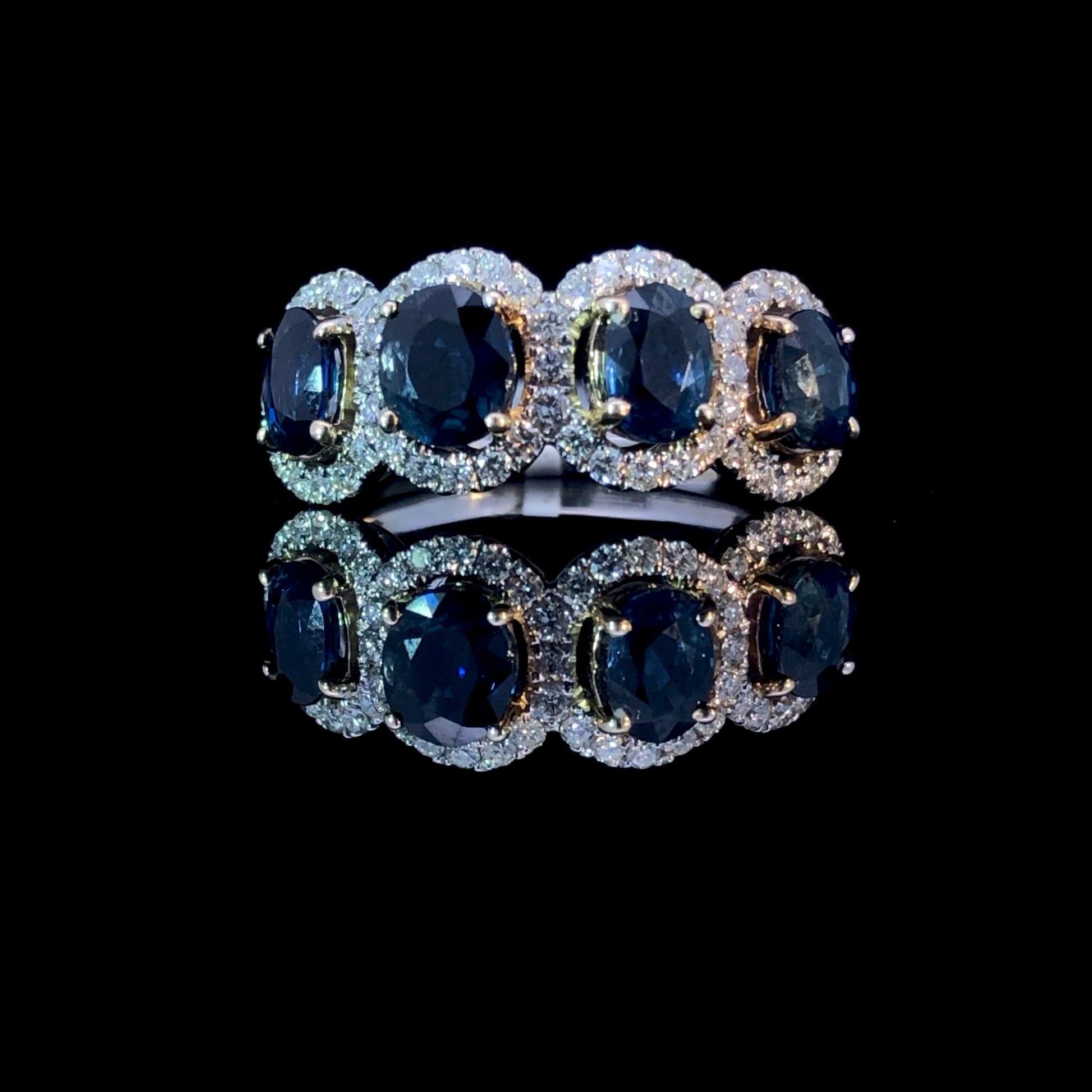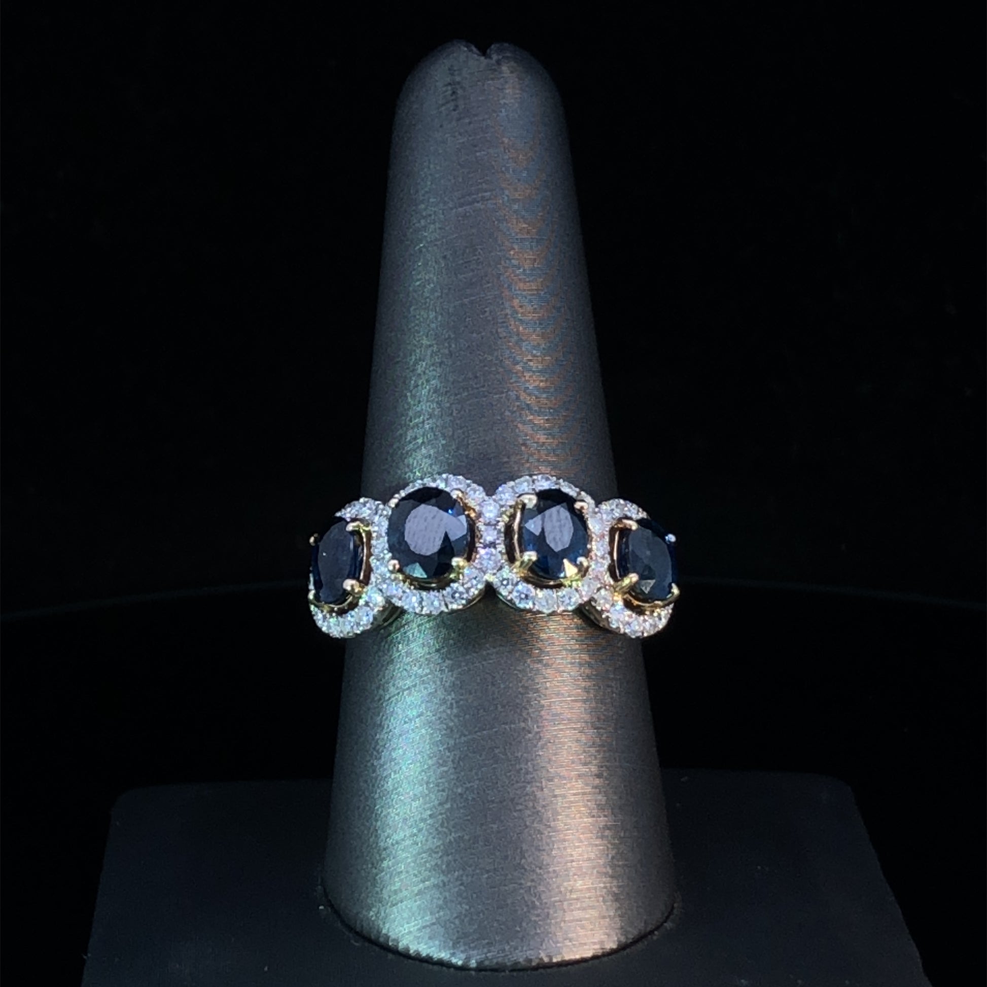 Add a bit of luxury to your wardrobe with this exquisite 14kt 2-tone gold statement piece, which features shimmering 4 oval sapphires totaling 2.65ctw set in elegant yellow gold heads, enhanced with a brilliant halo of diamonds around each for a total weight of 3.25ctw. The perfect accessory to make any look sparkle! This ring is a size 9. If that size is not a perfect fit, first time sizing is free at the time of purchase. Additional sizing fees may apply.