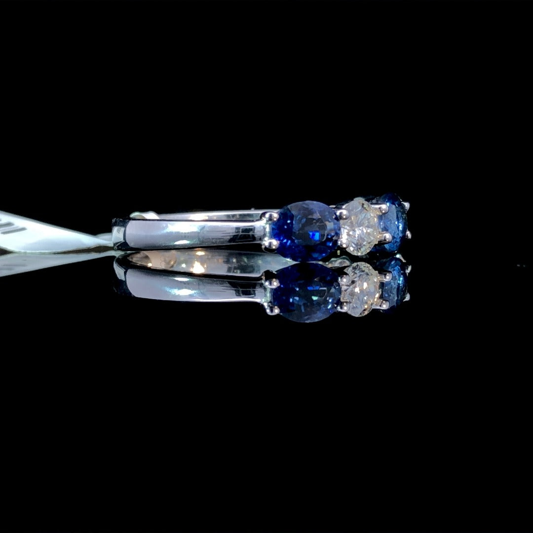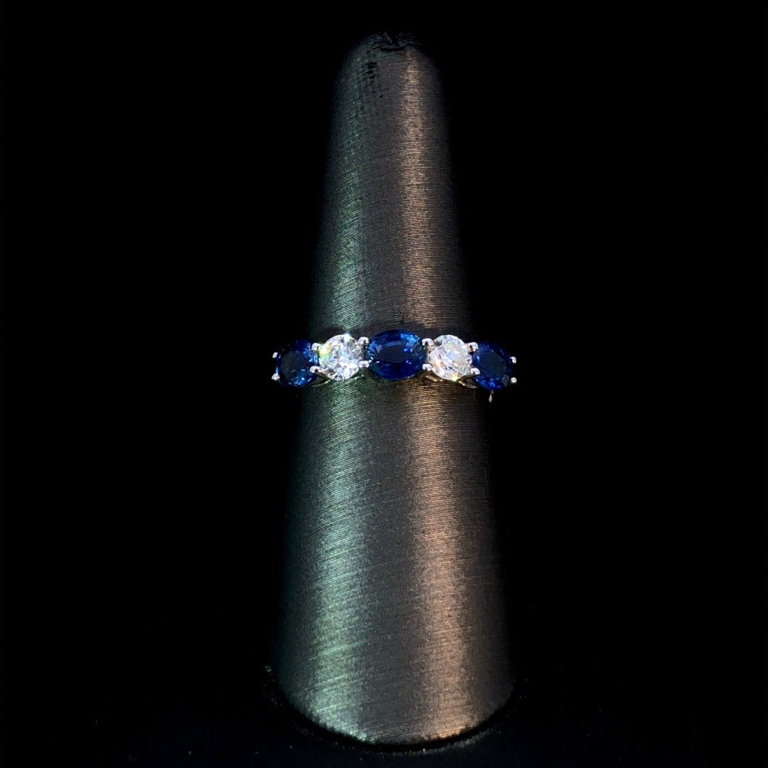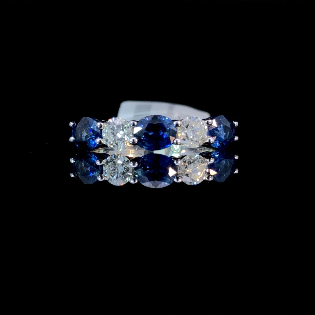 Expertly crafted in 14kt white gold, this dazzling diamond and sapphire band boasts a 2.48ctw of alternating oval sapphires and round diamonds. Elevate any outfit with its timeless elegance. This ring is a size 7.25. If that size is not a perfect fit, first time sizing is free at the time of purchase. Additional sizing fees may apply.