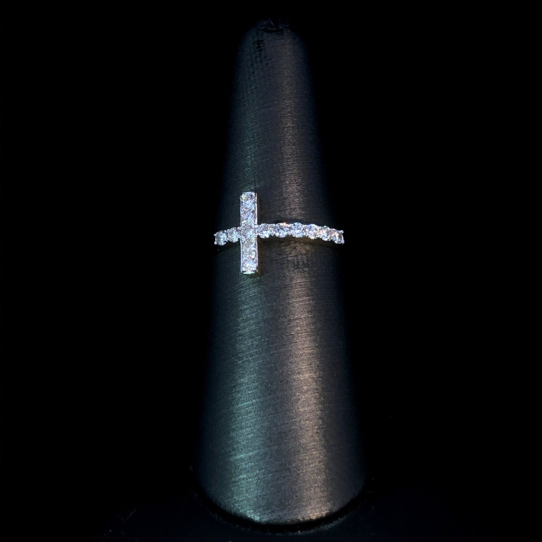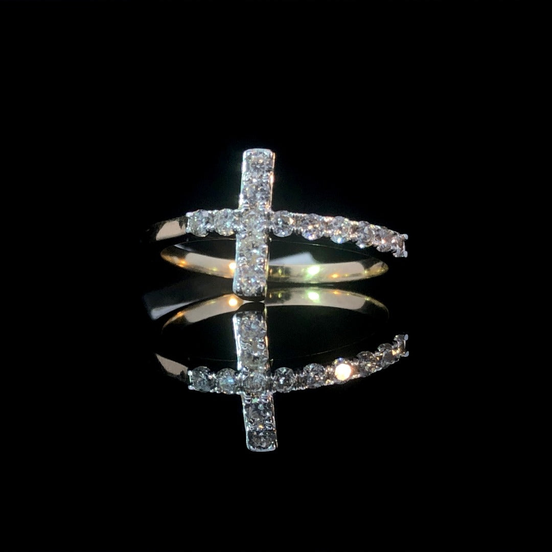 Elevate your style with this beautiful ring. Crafted in 14kt yellow gold, it features a stunning east-to-west diamond encrusted cross. Symbolize your faith with this elegant and meaningful piece, boasting a total diamond weight of .38ctw. A true luxury for your jewelry collection. This ring is a size 6.75. If that size is not a perfect fit, first time sizing is free at the time of purchase. Additional sizing fees may apply.