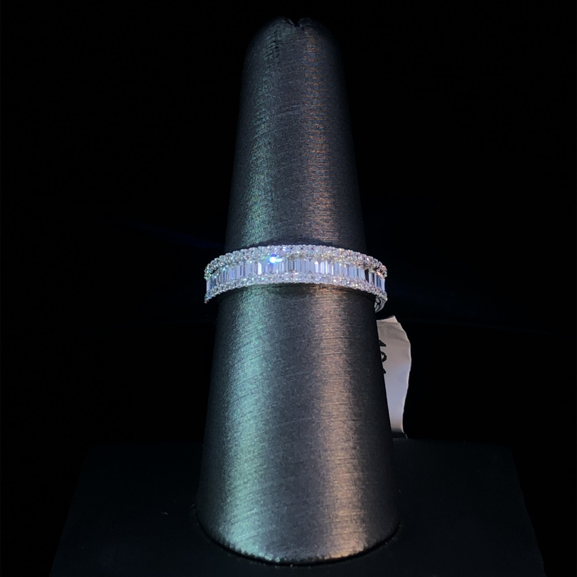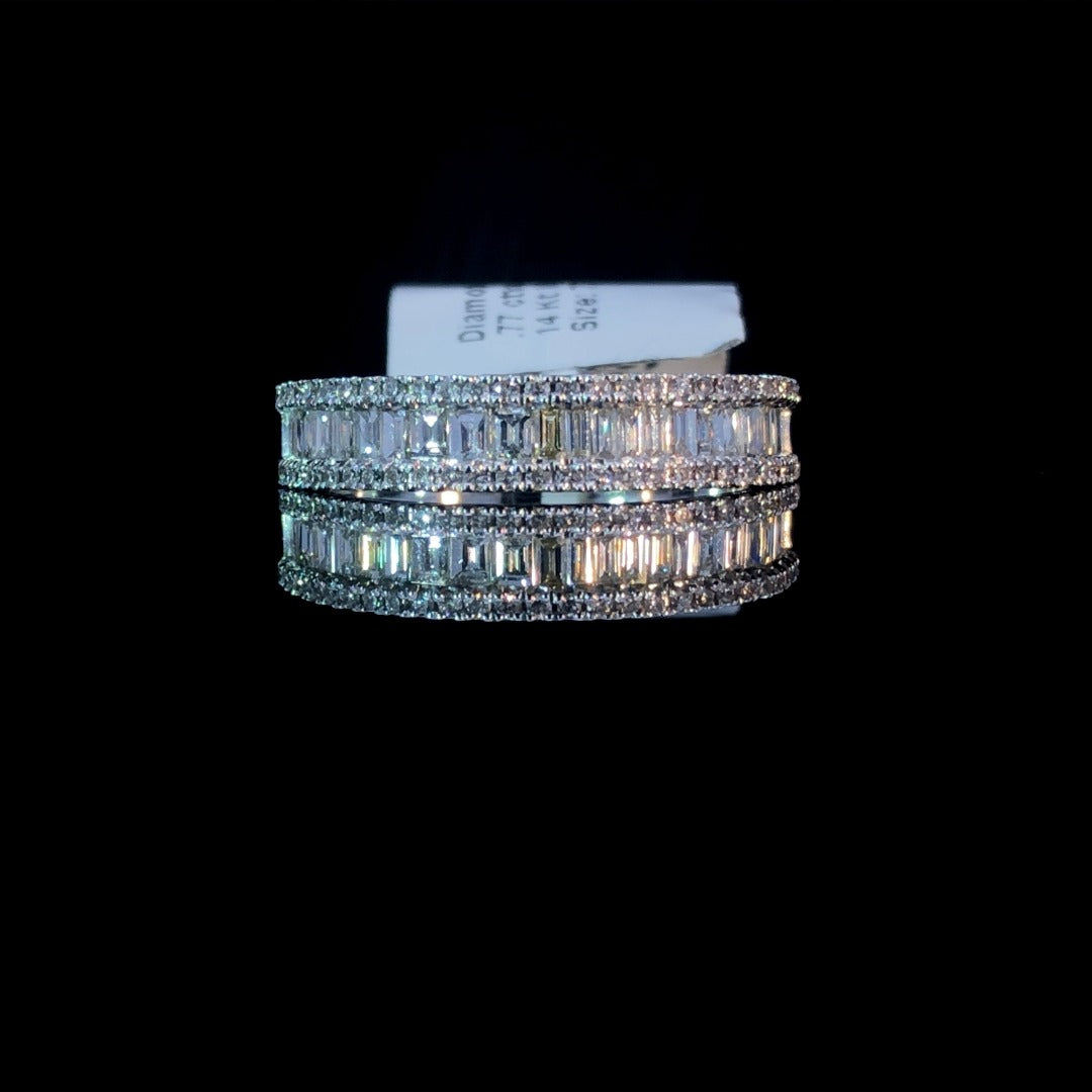 This exquisite diamond band is sure to make a dazzling statement. With .57ctw of diamond baguettes centered in 14kt white gold, and .20ctw of round diamonds on the edges, it’s a stunning choice that will be treasured for years to come. Dare to sparkle! This ring is a size 7.25. If that size is not a perfect fit, first time sizing is free at the time of purchase. Additional sizing fees may apply.