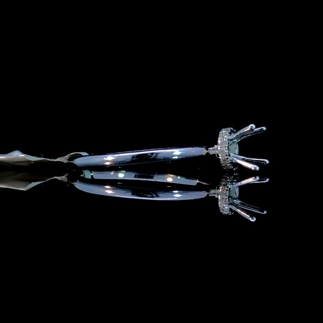 This elegant diamond semi mount provides the perfect setting for your chosen round center stone from our exceptional loose stone collection. Made of 14kt white gold, it also features a hidden halo of sparkling round diamonds totaling .08ctw. Elevate your style with this chic and sophisticated piece. Price is for the semi mount only. Center stone will be added at an additional cost. This ring is a size 7. If that size is not a perfect fit, first time sizing is free at the time of purchase. Additional sizing fees may apply.
