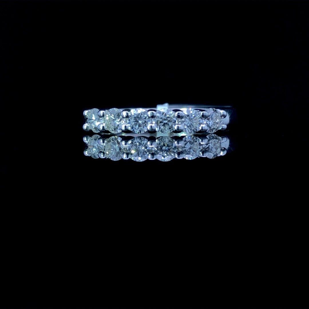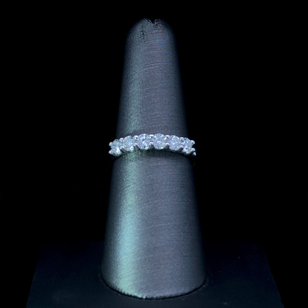 This elegant 14kt white gold diamond band is a timeless piece of true luxury. Hosting six round diamonds set for a total weight of 0.73ctw, the band's shimmering beauty captures a sophisticated, refined sparkle. Treat yourself to the dazzling, exclusive elegance of this classic diamond band. This ring is a size 7.25. If that size is not a perfect fit, first time sizing is free at the time of purchase. Additional sizing fees may apply.