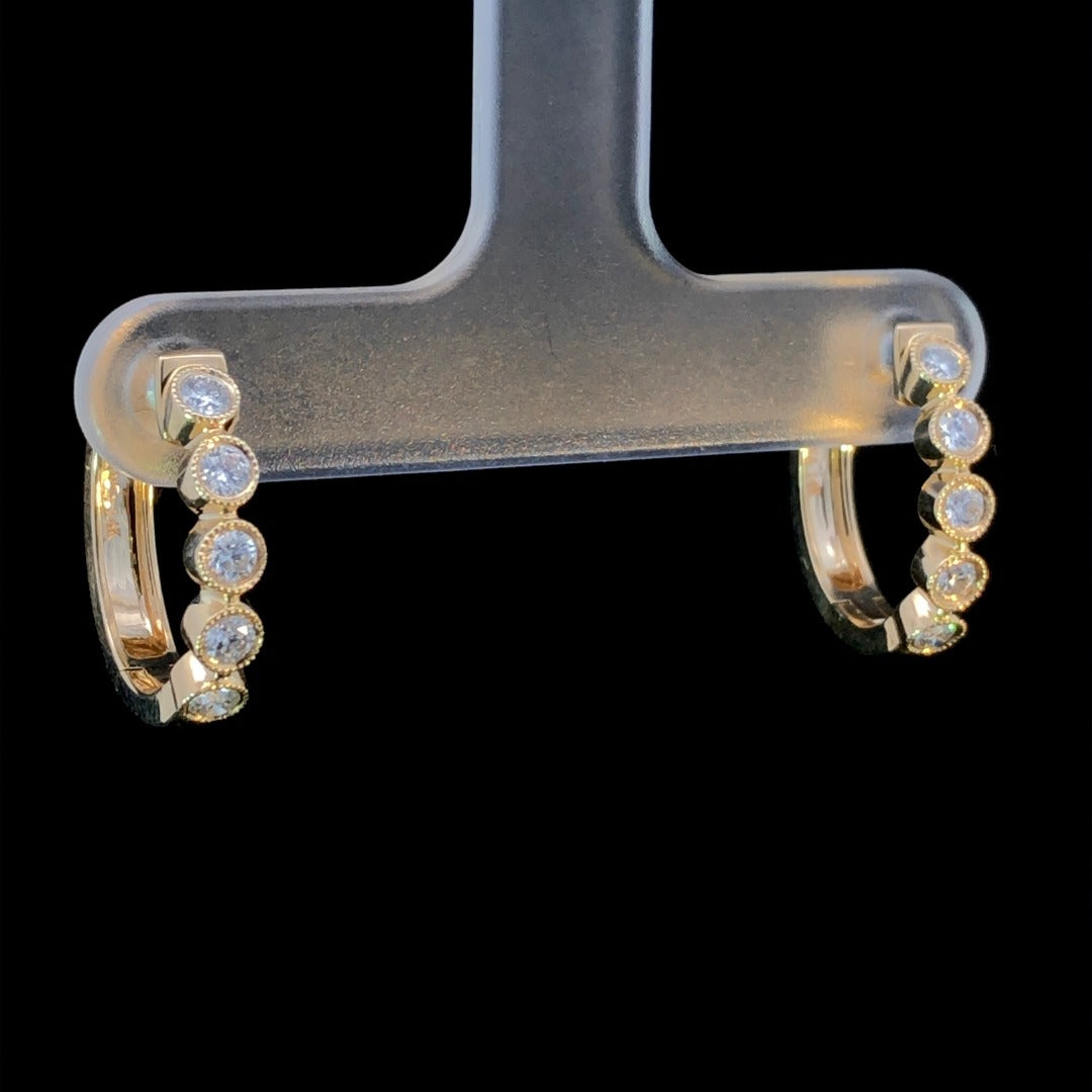 Elevate your jewelry collection and make a bold statement with these sophisticated diamond hoop earrings. Crafted in 14kt yellow gold and adorned with .40ctw of sparkling round diamonds, each stone is delicately outlined with milgrain detail for a timeless and elegant look. Perfect for any occasion.