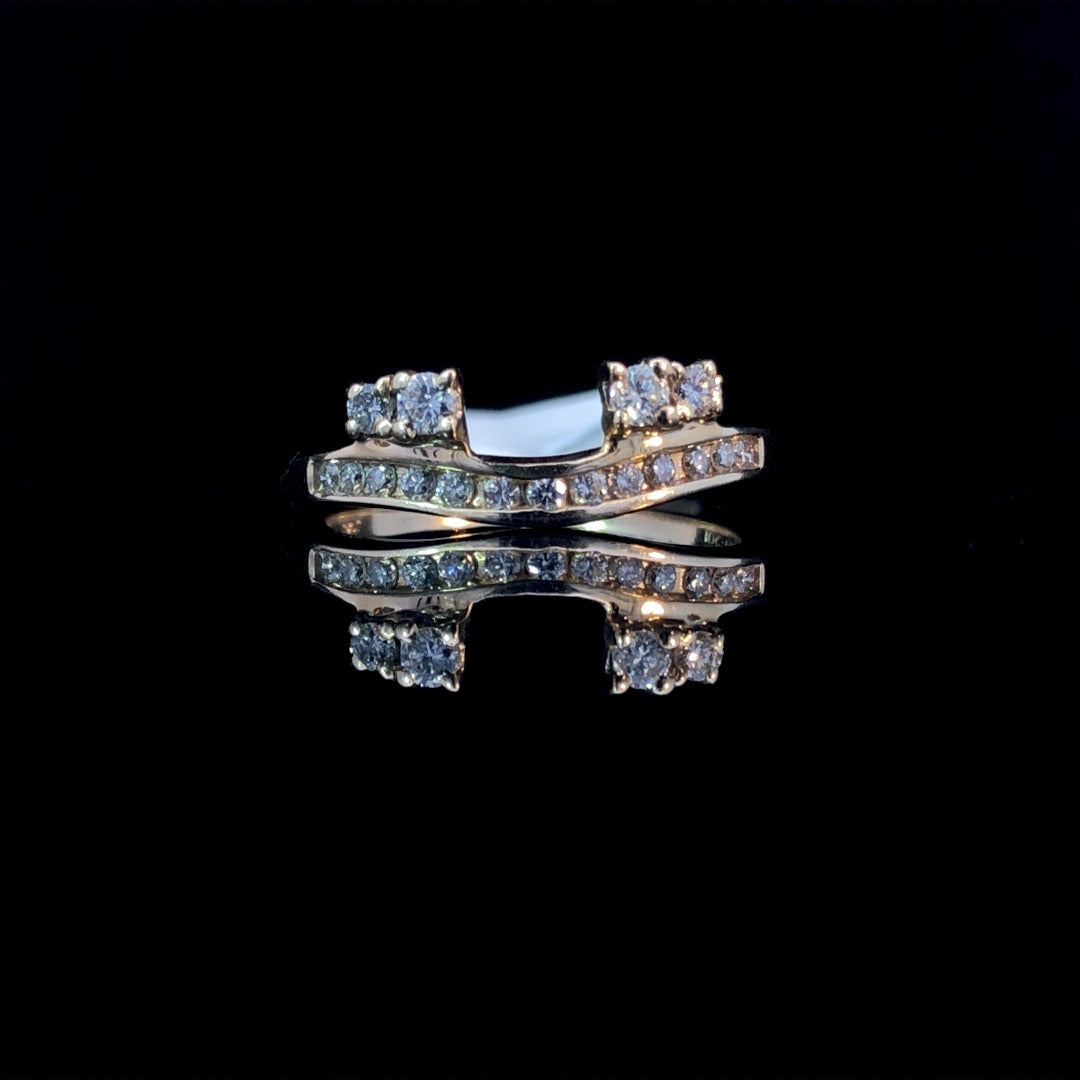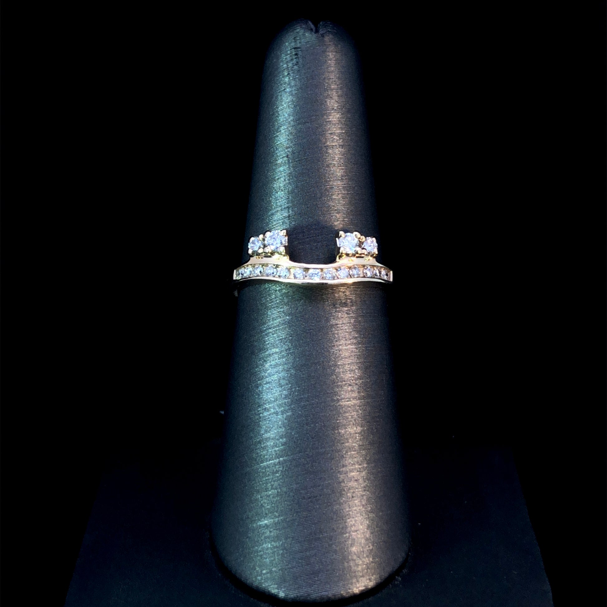 Crafted with exquisite detail, this 18kt yellow gold ring guard is graced with .26ctw of round diamonds to add a brilliant sparkle to your ring. With its timeless elegance, this piece will never go out of style. Now your ring is truly dazzling! This ring is a size 6.75. If that size is not a perfect fit, first time sizing is free at the time of purchase. Additional sizing fees may apply.